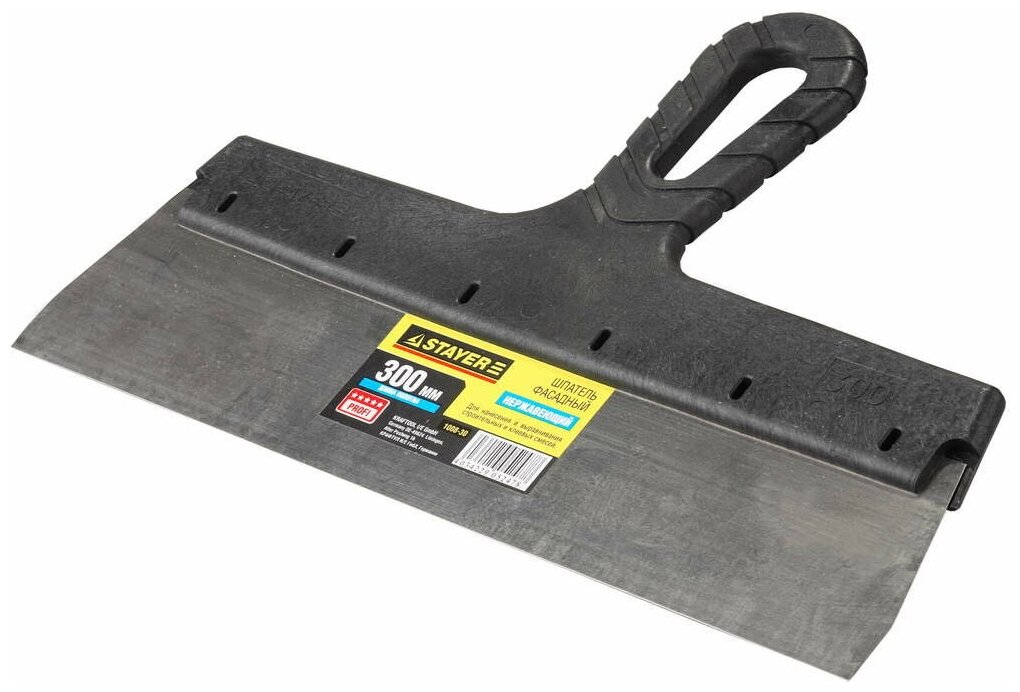 | Прочие особенности и свойства | Шпатель фасадный STAYER PROFESSIONAL обладает удобным держателем из ударопрочного пластика и имеет отверстие для подвески. Лезвие трапециевидной формы произведено из высококачественной нержавеющей стали. Применяется для нанесения, а также выравнивания строительных смесей на различных поверхностях. |