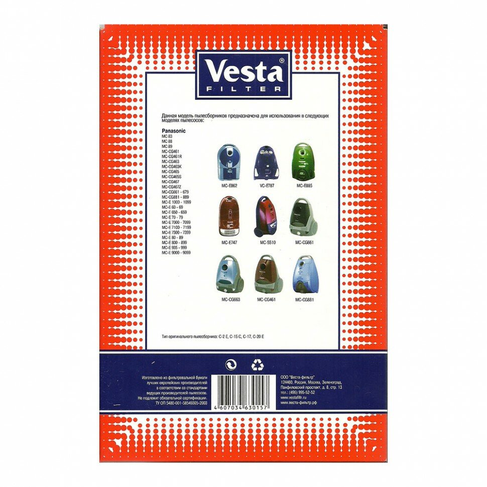 | Прочие особенности и свойства | Оригинальный пылесборник:C-2E, C-15C, C-17, C-20 E Такие мешки задерживают более 99% пыли. |