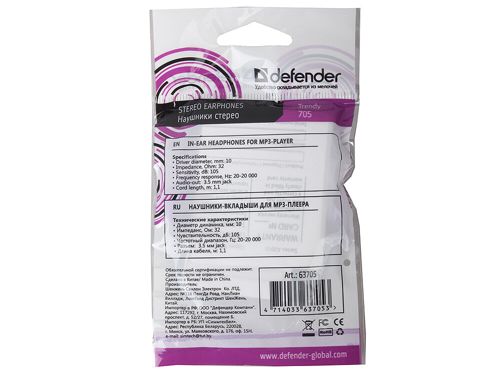 Наушники вставные Defender White-Lilac Trendy-706