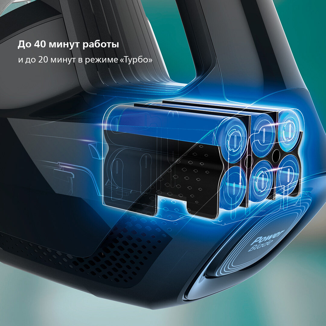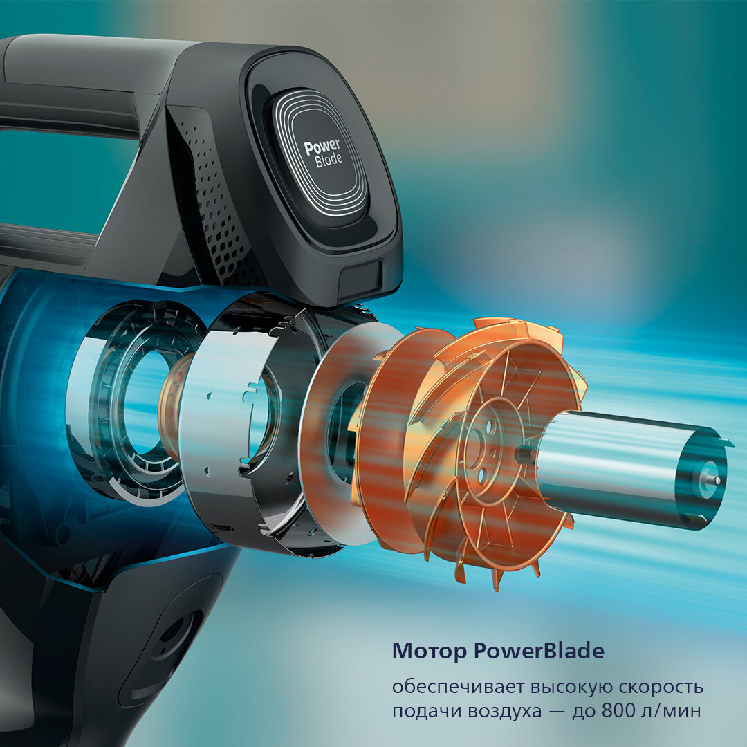 Мотор PowerBlade обеспечивает высокую скорость подачи воздуха, а также мощный и точный сбор грязи насадкой.