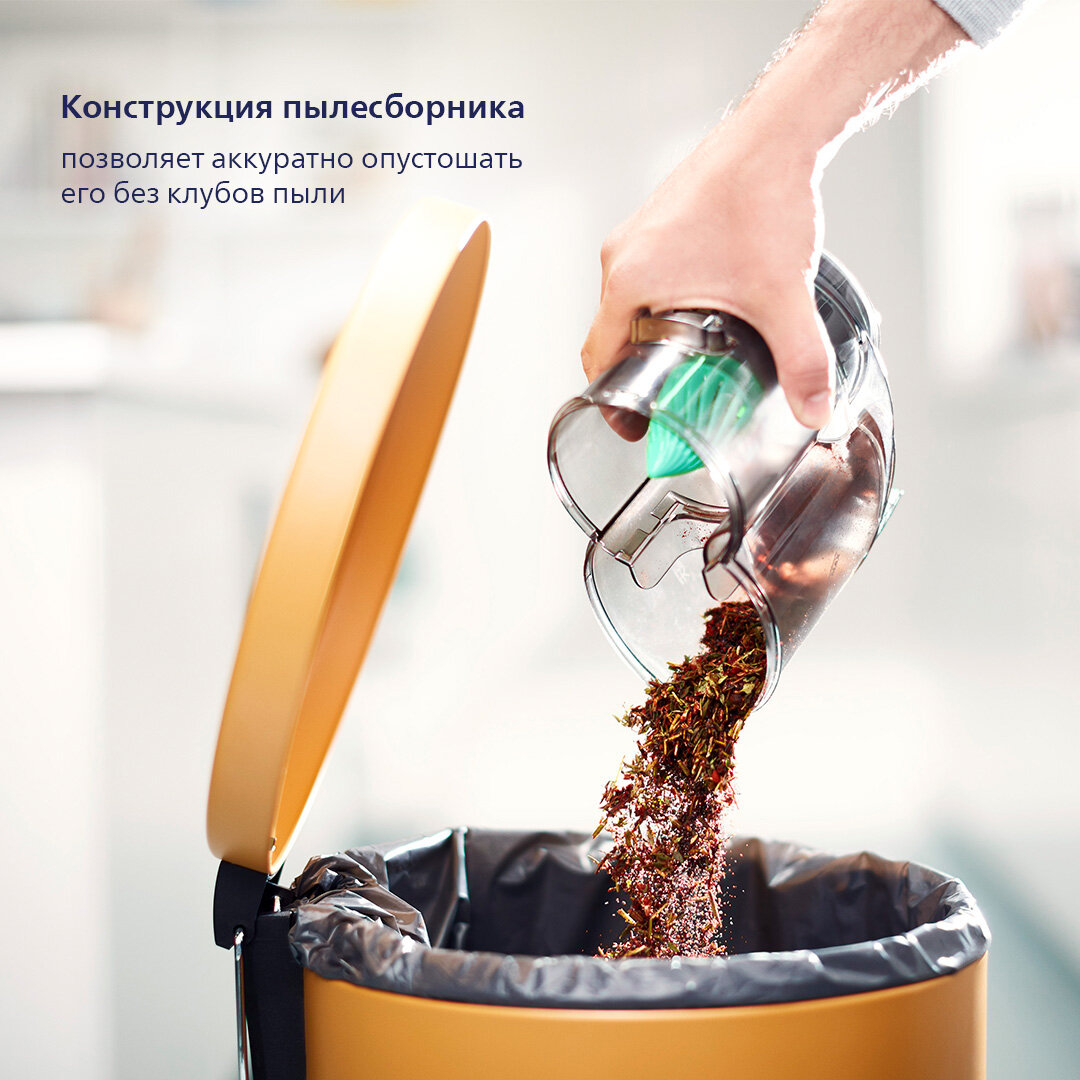 Пылесборник легко снимается с пылесоса и гигиенично опустошается без облака пыли.