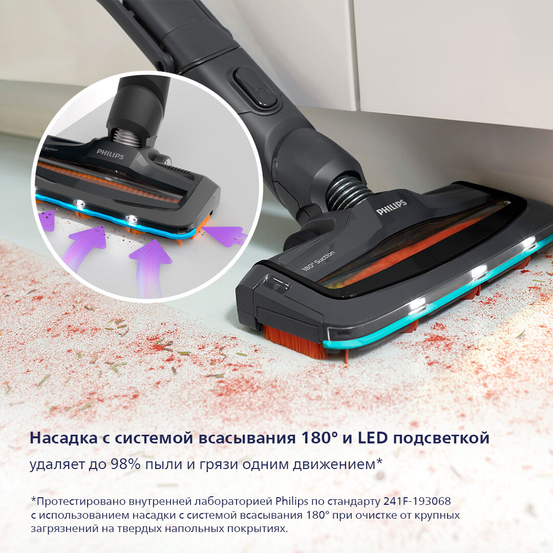 Насадка с системой всасывания 180° предназначена для мощного и точного сбора до 98 % загрязнений на любых типах напольных покрытий, даже в труднодоступных местах, каждым движением.