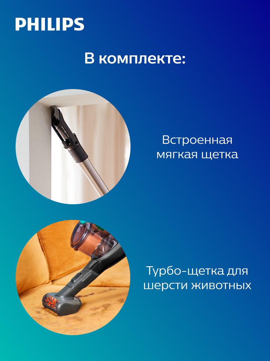 | Насадки в комплекте | Встроенная щетка, Мини-турбощетка, Насадка с системой всасывания, Щелевая насадка |