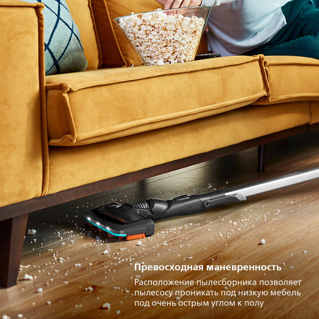 SpeedPro отличается превосходной маневренностью, поскольку пылесборник расположен вверху корпуса, так что он может проникать под низкую мебель под очень острым углом к полу.