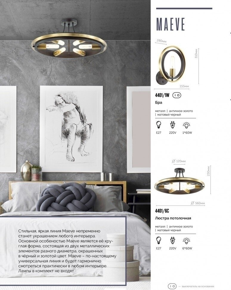 Стильная, яркая серия Maeve непременно станет украшением любого интерьера. Основной особенностью Maeve является её круглая форма, состоящая из двух металлических элементов разного диаметра, окрашенных в чёрный и золотой цвет.