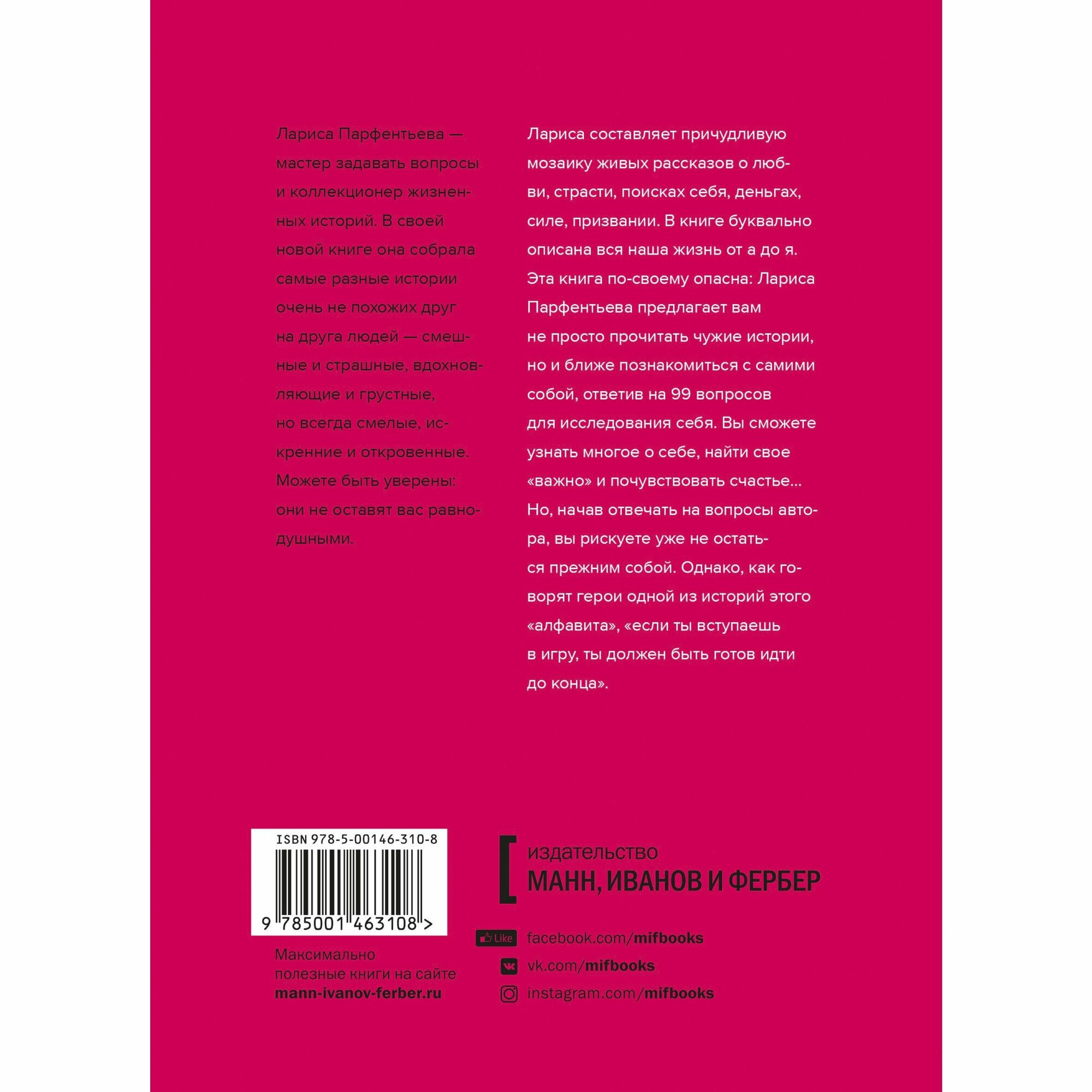 Эта книга - мозаика живых рассказов о любви, страсти, поисках себя, деньгах, силе, призвании. В ней буквально описана вся наша жизнь от А до Я. Эта книга по-своему опасна: помимо историй, в ней 99 вопросов для исследования себя, а начав отвечать на них, вы рискуете уже не остаться прежним собой. Но, как говорят герои одной из первых историй этого Алфавита, "если ты вступаешь в игру, ты должен быть готов идти до конца".