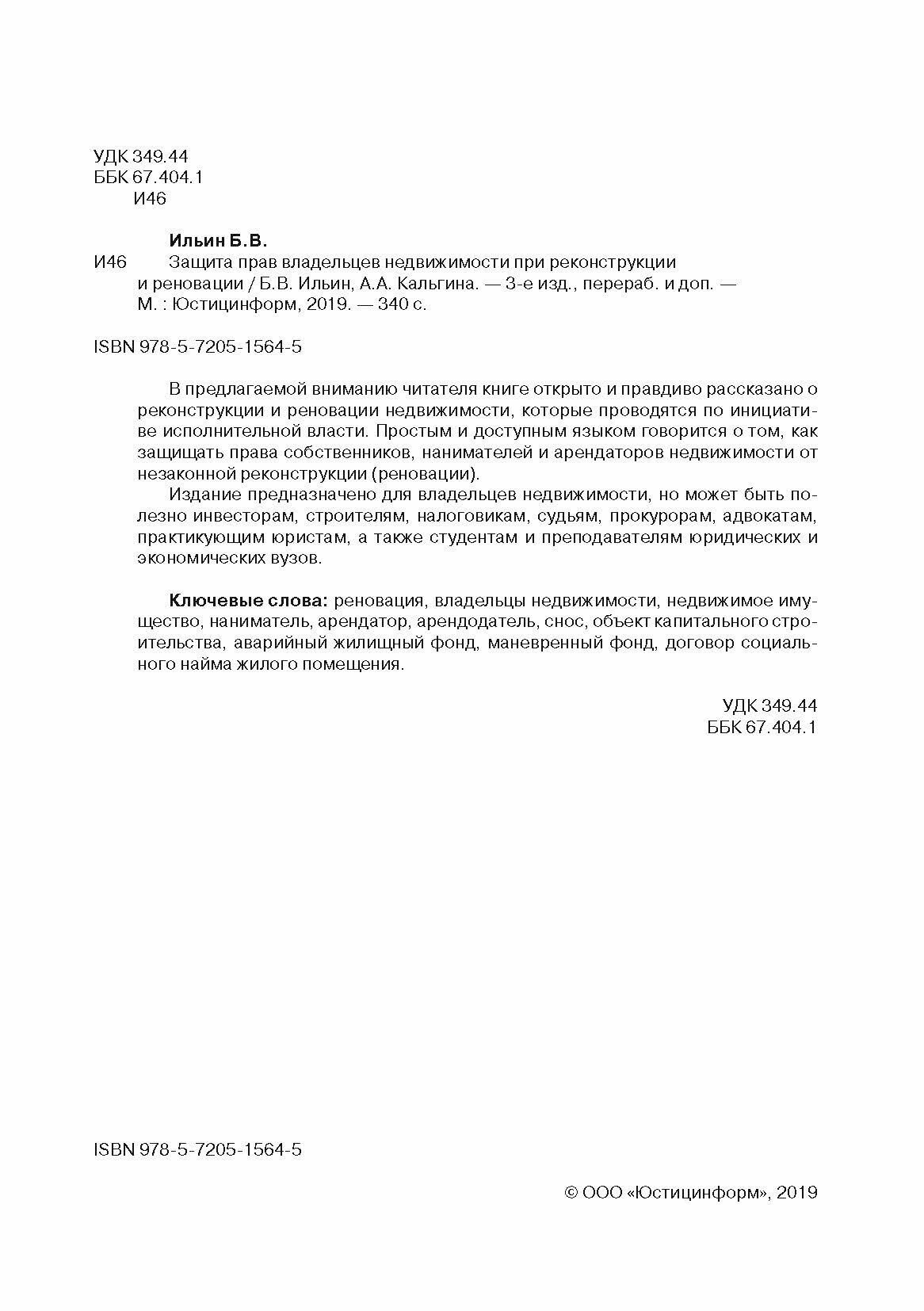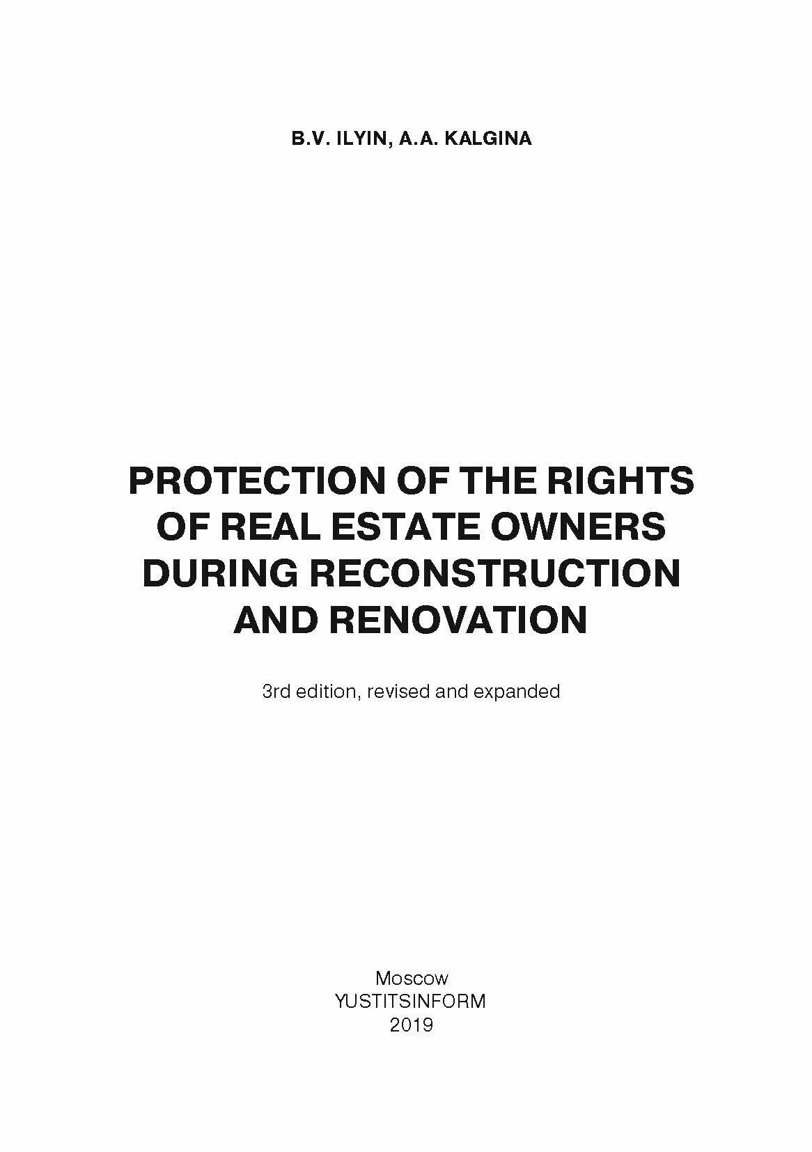 Защита прав владельцев недвижимости при реконструкции и реновации (Ильин Борис Владиславович, Кальгина Александра Александровна); Юстицинформ, 2019