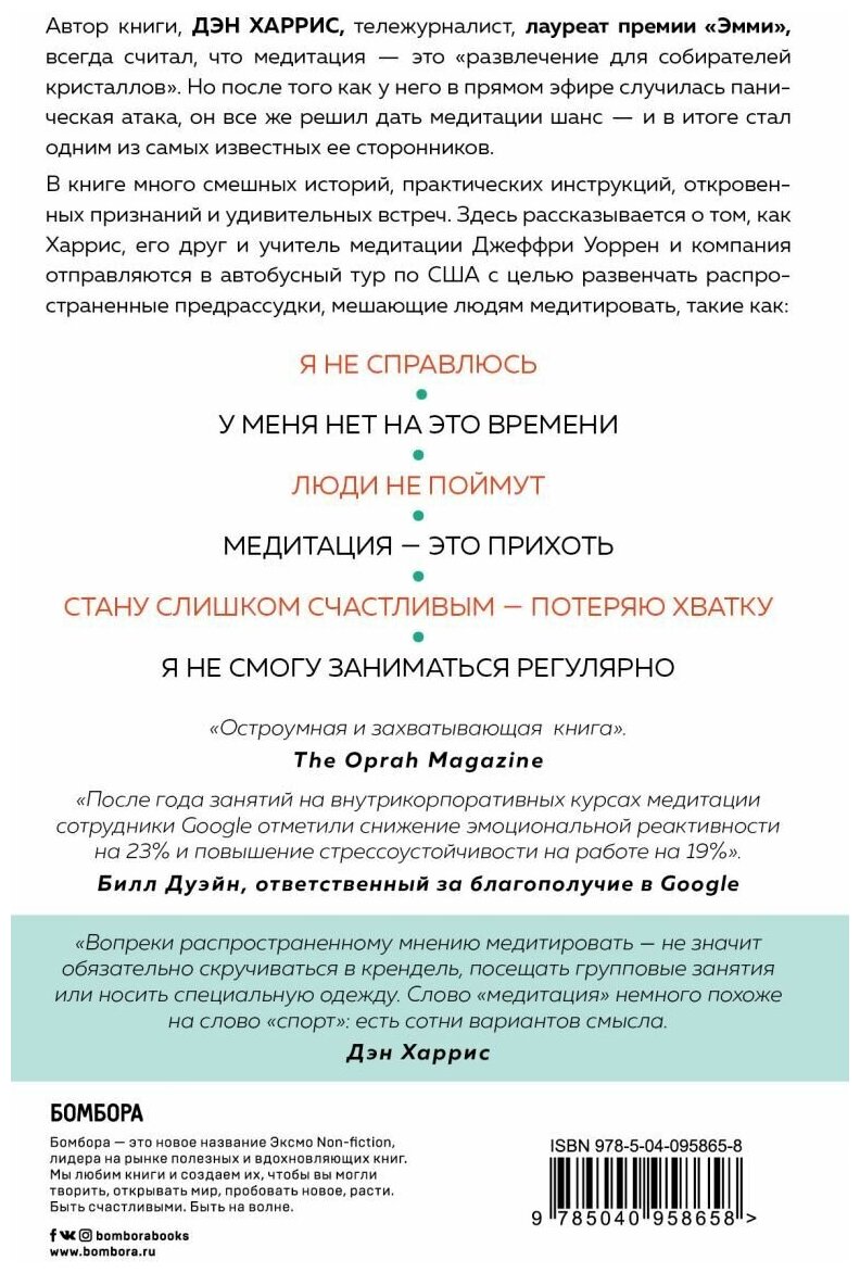 С целью познакомить с медитацией таких же скептиков, каким был он сам, и развенчать самые популярные заблуждения о ней, Дэн Харрис и компания решают отправиться колесить на автобусе по США, встречаясь с самыми разными людьми. О том, что из этого вышло, рассказывается в этой книге, пронизанной самоиронией и остроумными наблюдениями