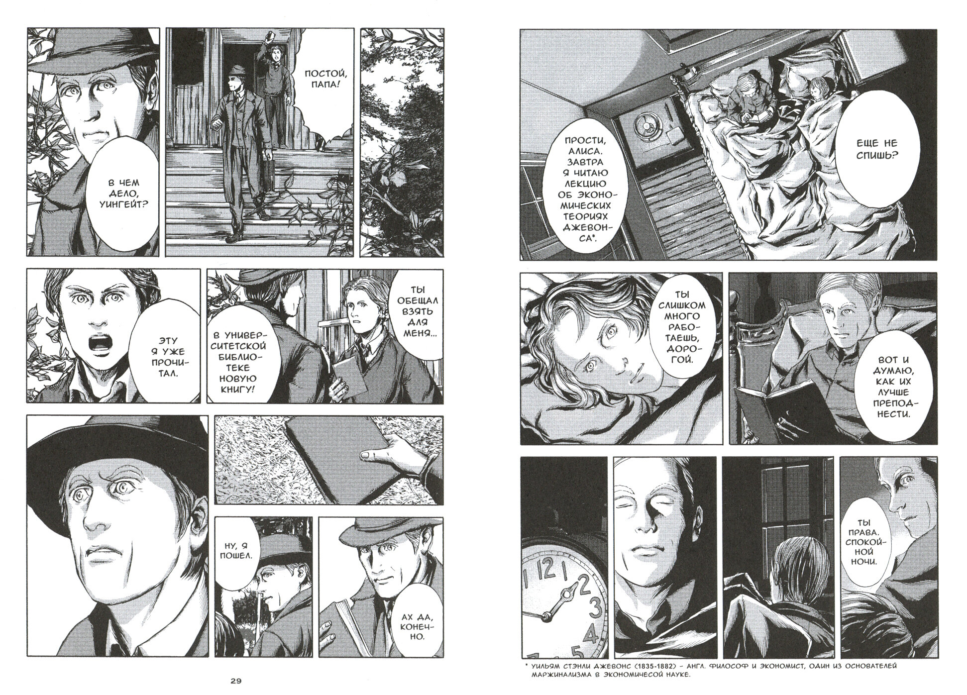 Это двухтомник. В начале первого тома цветные иллюстрации и цитата из собственно литературного произведения. Качество печати высокое. Для комикса очень сложная графика - скорее набор иллюстраций, чем комикс. Сюжет не очень динамичный: действие первого тома проходит в библиотеках, во втором томе - не продуктивная экспедиция в пустыню. Рекомендуется читать эту мангу после "Хребтов безумия".