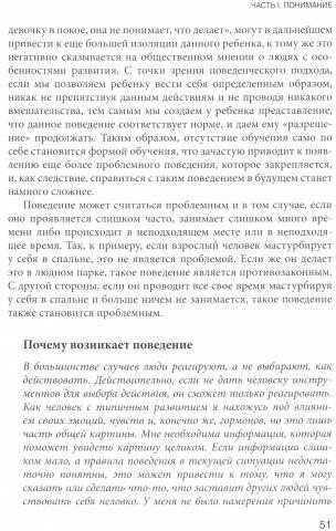 Кроме рекомендаций, методического материала в виде изображений и готовых фраз для бесед, в книге имеются вставки с рассказами из жизни реальных взрослых людей с РАС, которые бывает интересно, а иногда и грустно, читать.