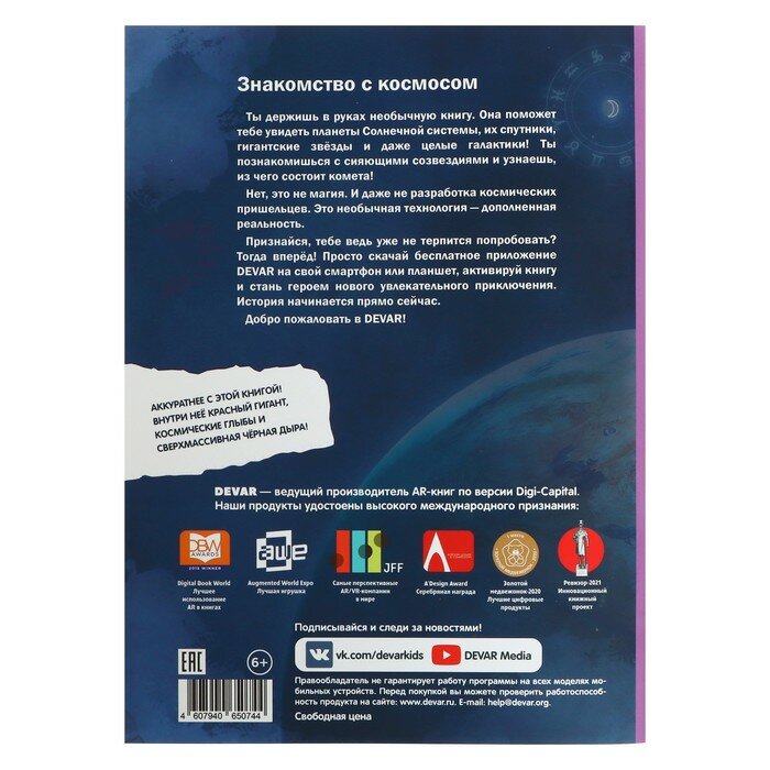 По многочисленным просьбам мы выбрали из наших популярных энциклопедий DEVAR самые увлекательные факты, объединили их и выпустили в более компактном формате. Теперь каждый сможет слетать на Марс и добраться до раскалённого ядра Земли! Тебя уже ждут звёздные туманности и дальние галактики! Они "оживут" прямо у тебя дома в 4D объеме в дополненной реальности с помощью бесплатного приложения от DEVAR.