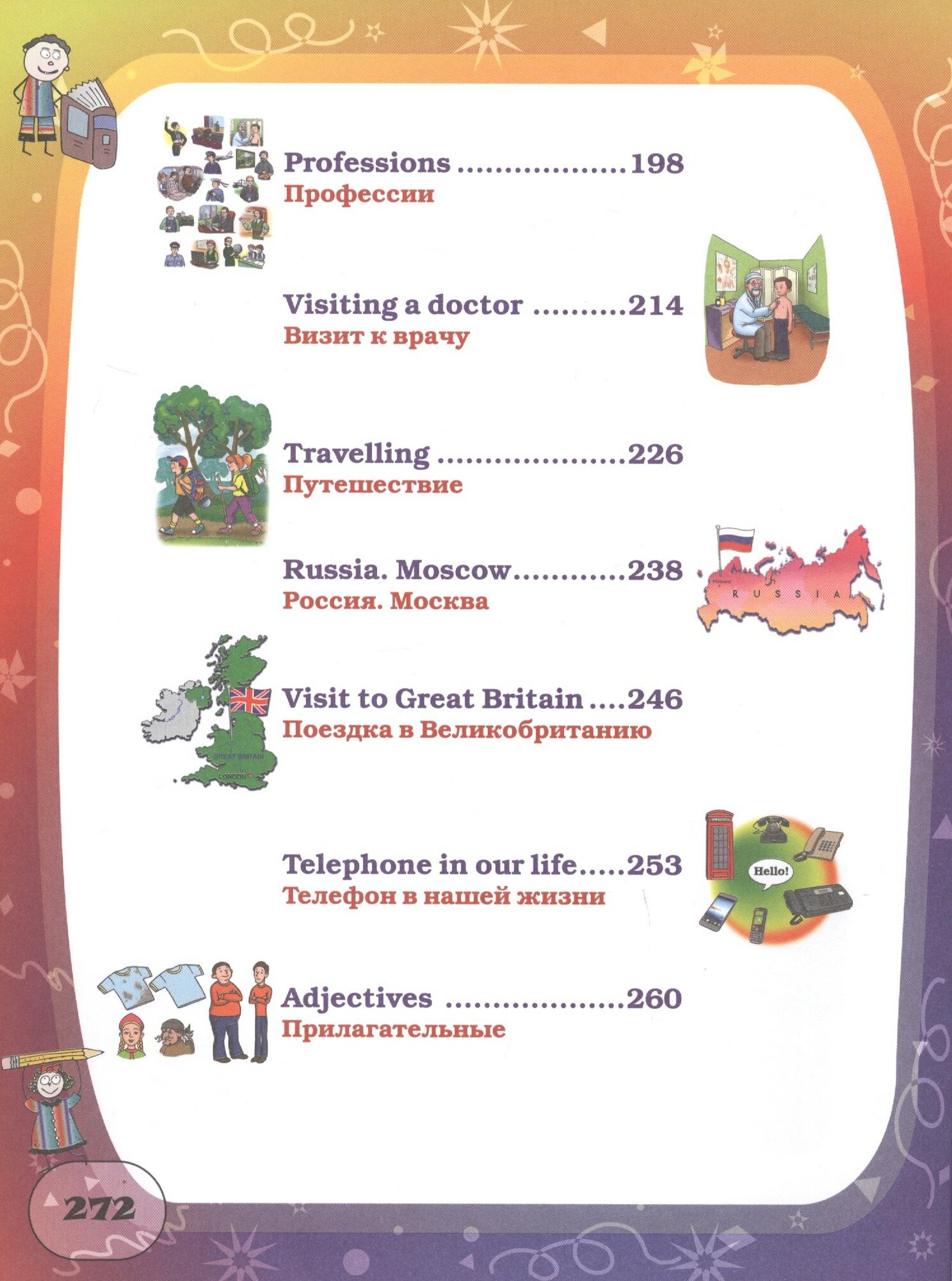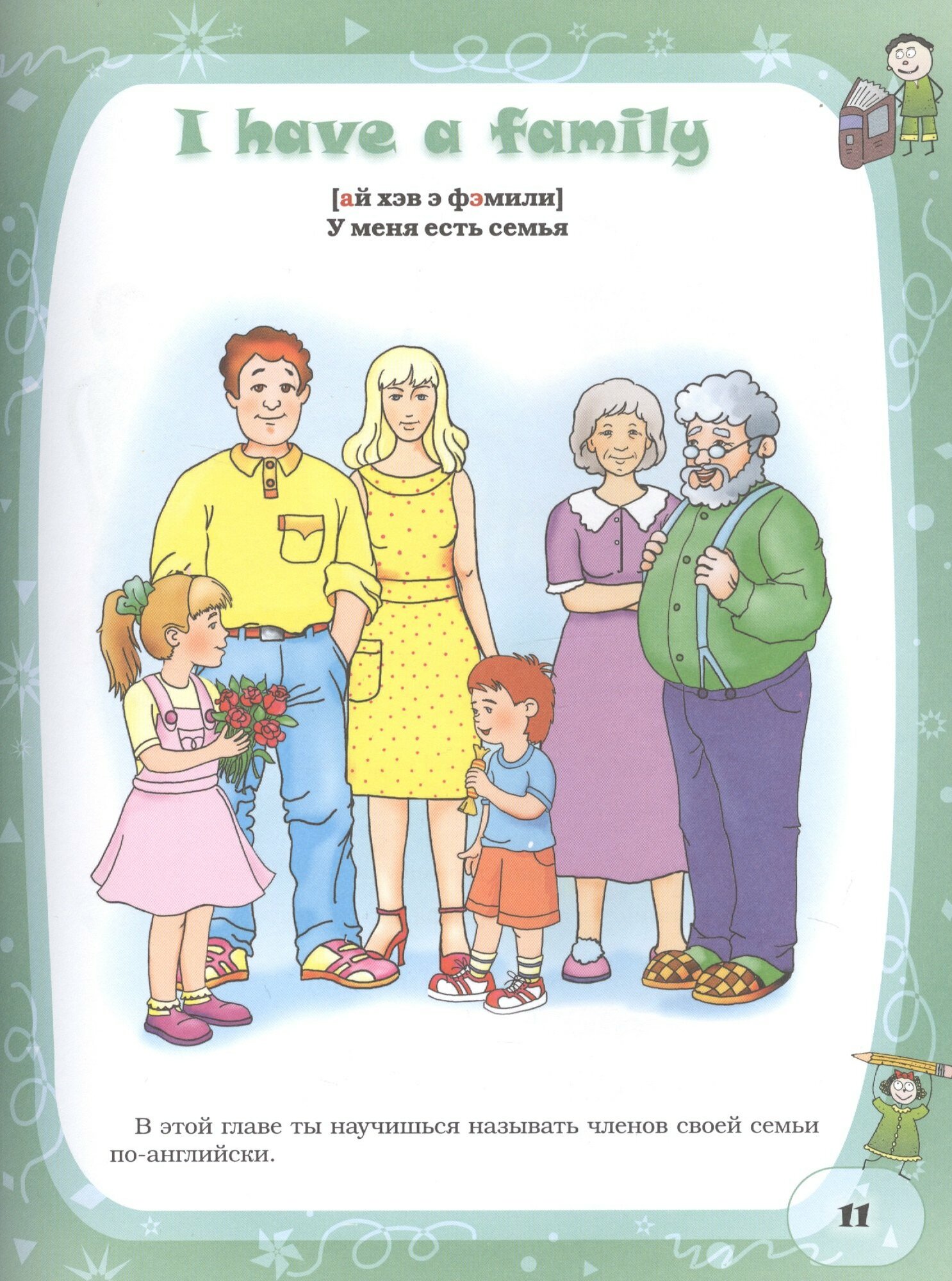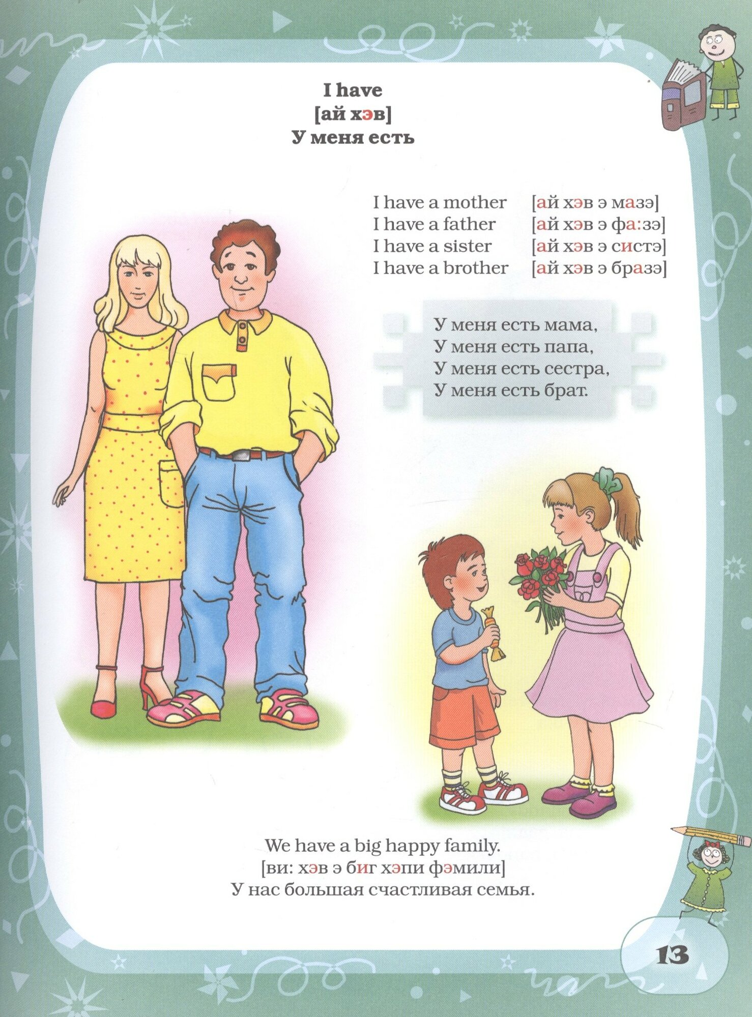 На страницах этой книги ребёнок научится знакомиться на английском языке, рассказывать про свою семью и дом, делать покупки в магазине, узнает, как называются различные фрукты и овощи, еда и посуда, игрушки и одежда, животные и растения, цвета, цифры и дни недели. Также в книге представлены следующие темы для изучения: тело, профессии, город, транспорт, школа, посещение врача, путешествия, месяцы и времена года, время, спорт и праздники. Удачи вам и вашему ребёнку в изучении английского!