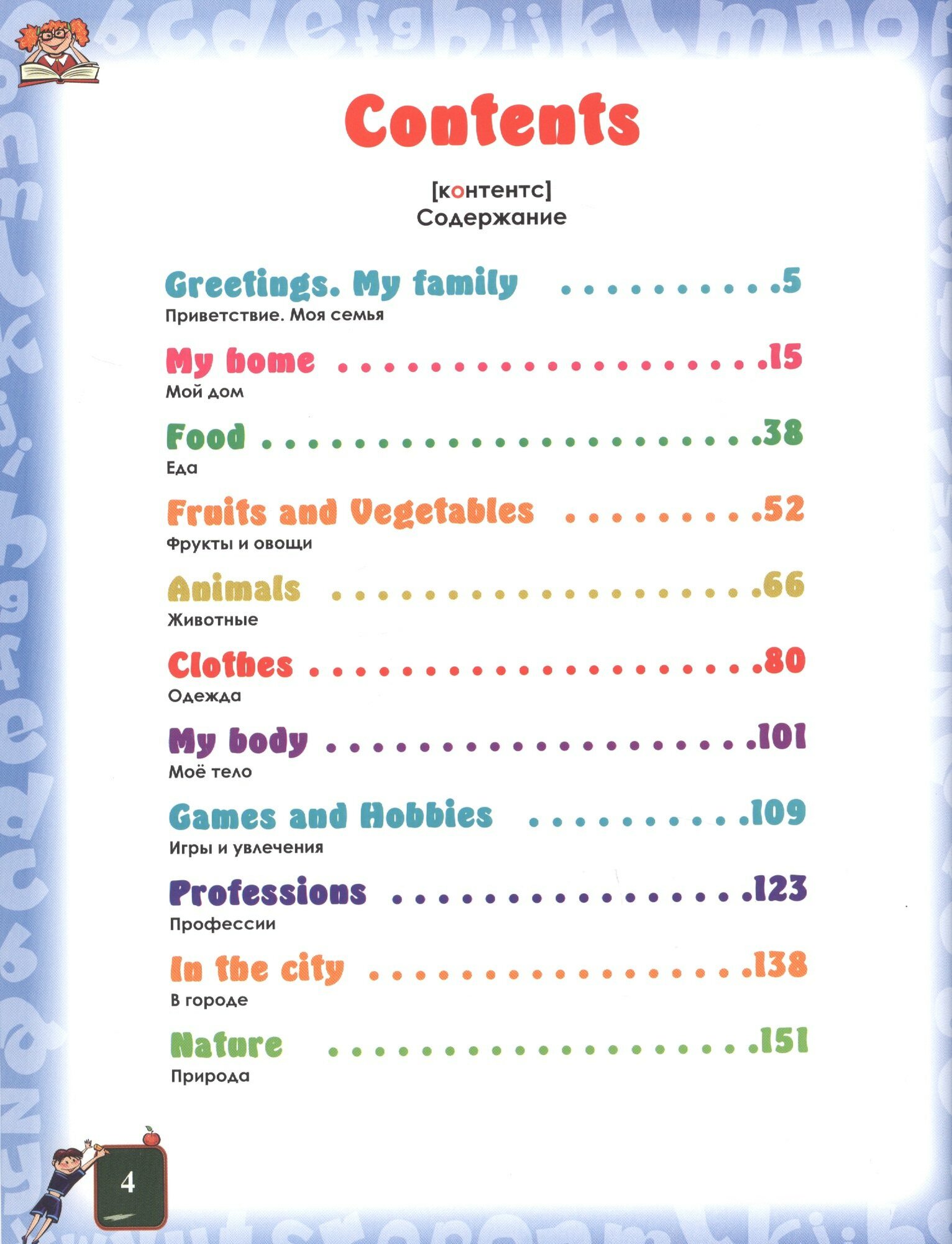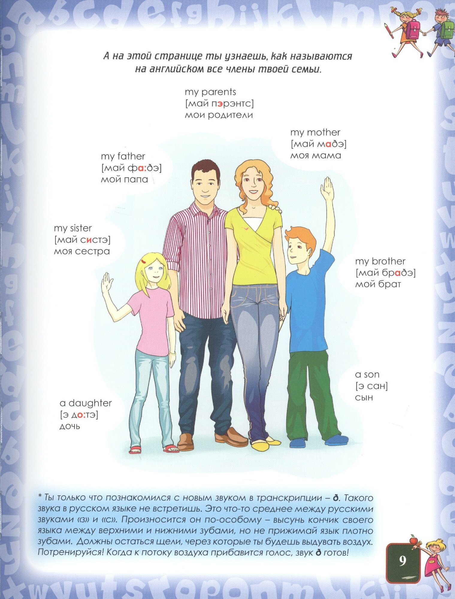 Эта полезная красочная книга поможет вашему ребенку сделать первые шаги в изучении английского языка. Яркие иллюстрации, интересные задания и весёлые стихи сделают обучение увлекательным, похожим на игру. Вместе со своим малышом вы узнаете, как по-английски называются члены вашей семьи, какие предметы окружают вас в вашем доме, как рассказать про погоду на улице, и многое другое. Приглашаем вас и вашего ребёнка в путешествие по миру английского языка!