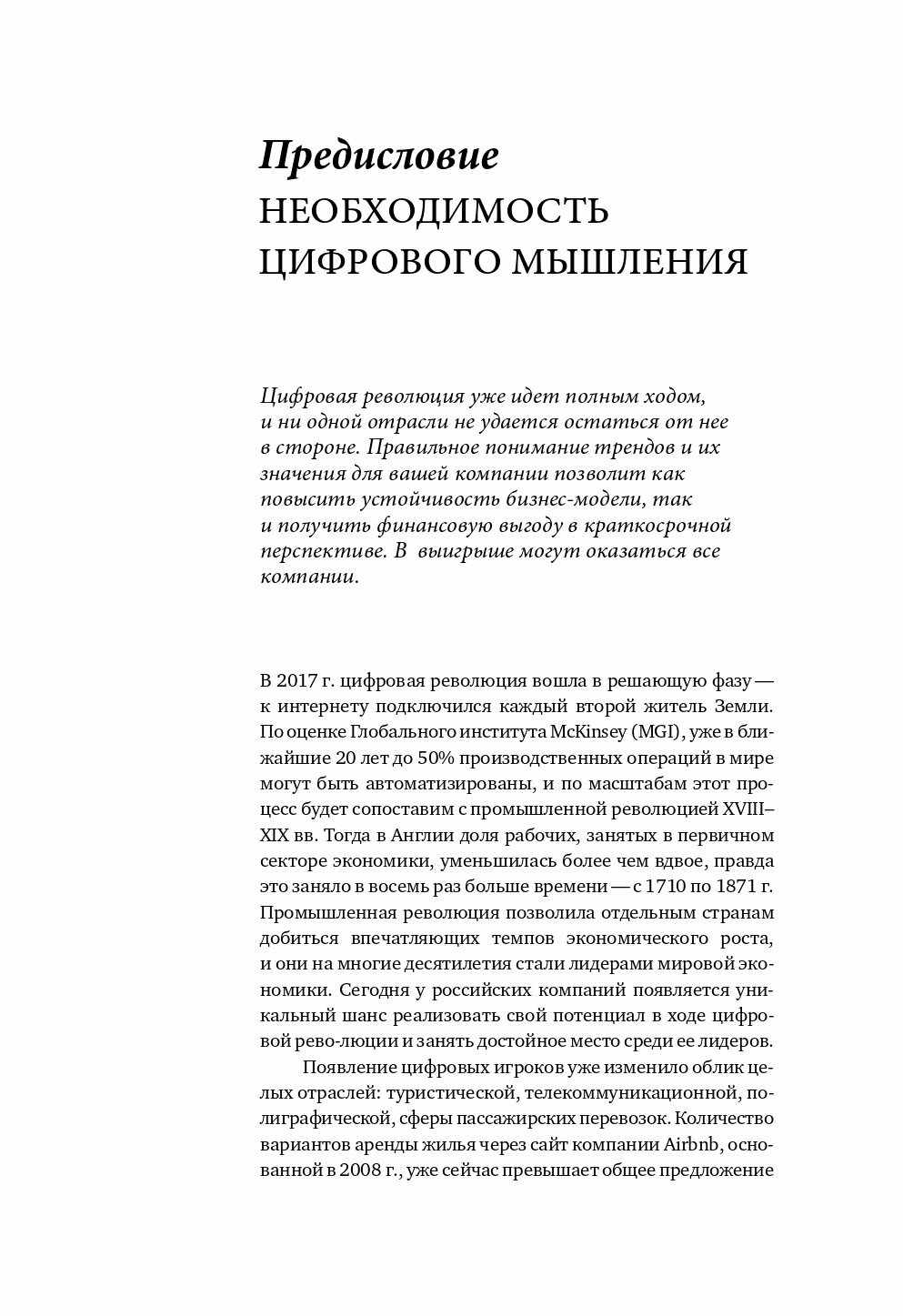 Мы живем в эпоху, когда цифровая революция вошла в свою решающую фазу - интернет использует каждый второй житель Земли. Целые отрасли претерпевают кардинальные изменения из-за появления цифровых игроков. В эпоху цифровых технологий выживание компаний зачастую зависит от того, способны ли они пересмотреть свои отношения с клиентами, переосмыслить такие важные элементы собственной бизнес-модели, как производственный контроль и взаимодействие с поставщиками, а может, и вовсе изменить саму модель монетизации своих услуг. Отказ признавать необходимость этих изменений чреват проигрышем и уходом с рынка. Что же конкретно нужно изменить именно в вашей компании и как это сделать? В этой книге вы найдете ответы на эти вопросы, узнаете опыт известных международных и российских компаний, что поможет вам и вашему бизнесу успешно провести цифровую трансформацию и с легкостью стать частью нового цифрового мира.