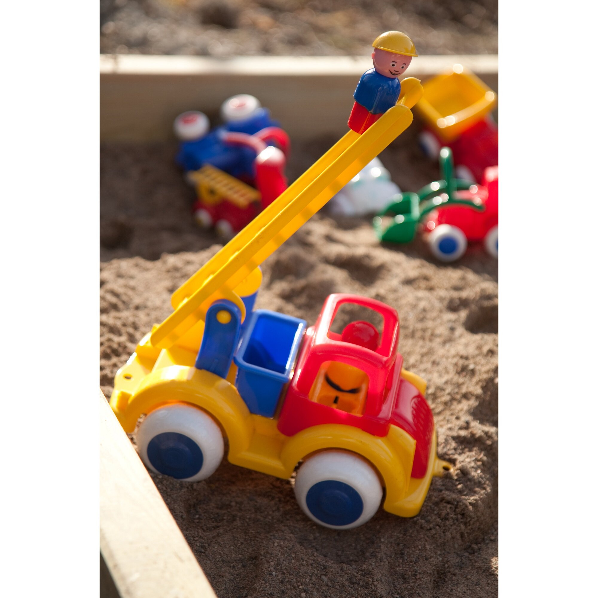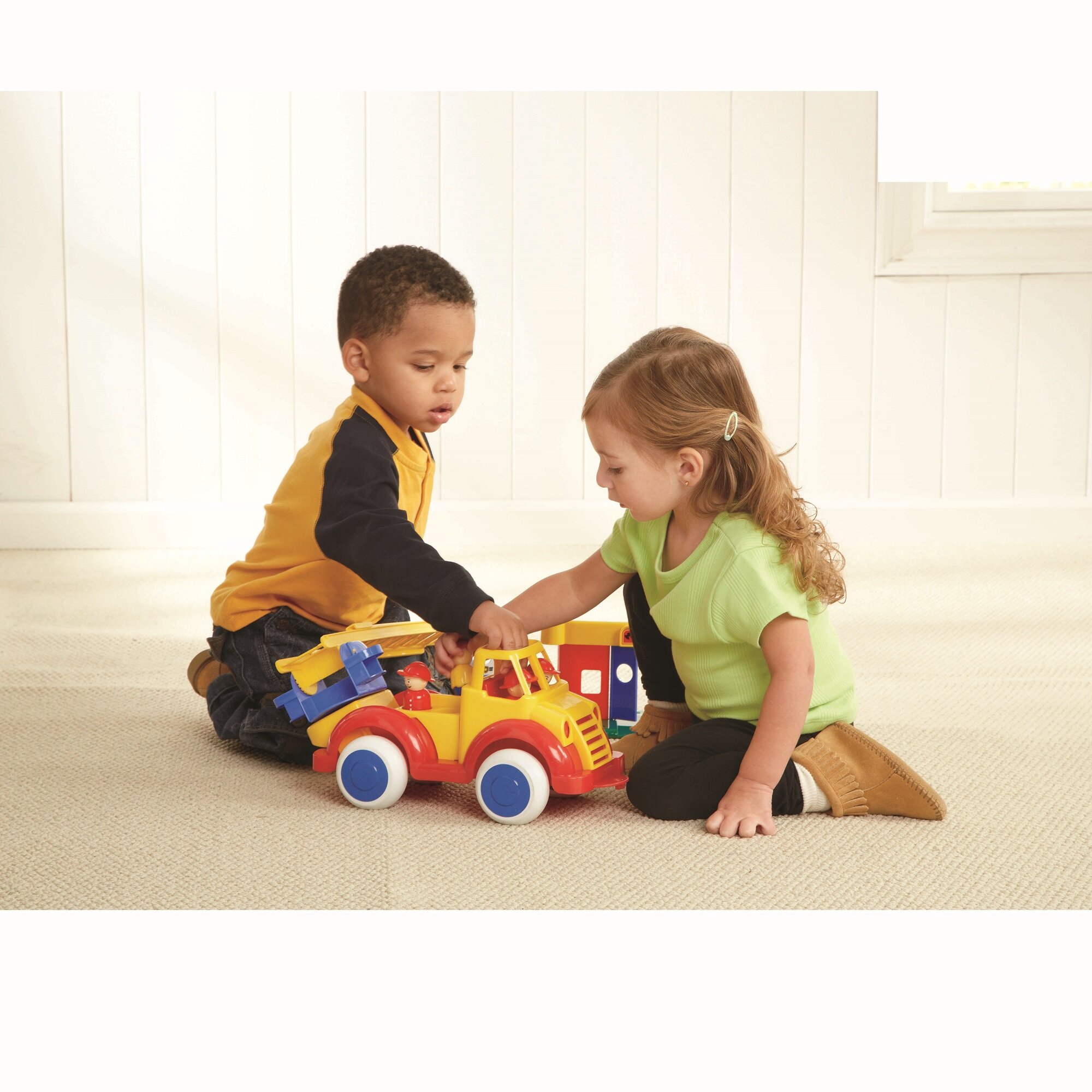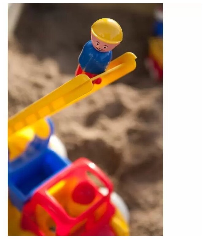 Кабина машины не имеет стекол, поэтому в нее можно поместить игрушечного водителя. В грузовом отсеке есть раздвижная лестница и бак для песка или воды. У машинки широкие колеса, она может быстро ехать по ровной поверхности.