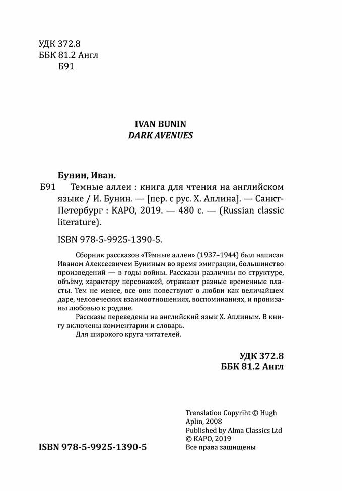 Предлагаем знаменитый сборник рассказов нобелевского лауреата Ивана Алексеевича Бунина на английском языке в переводе Хью Аплина. Сборник "Темные аллеи" (1937-1944) был написан во время эмиграции, большинство произведений - в годы войны. Книгу называют "энциклопедией любовных историй и главным эротическим произведением русской литературы". Рассказы различны по структуре, объему, характеру персонажей, отражают разные временные пласты. Все они повествуют о любви как величайшем даре, о человеческих взаимоотношениях, о воспоминаниях, и пронизаны любовью к родине.