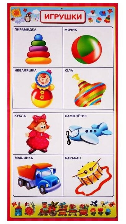 Тем много : алфавит, цифры, цвета и формы, название домашних и диких животных, времена года, члены семьи, игрушки, название овощей и фруктов, растения, одежда, посуда.