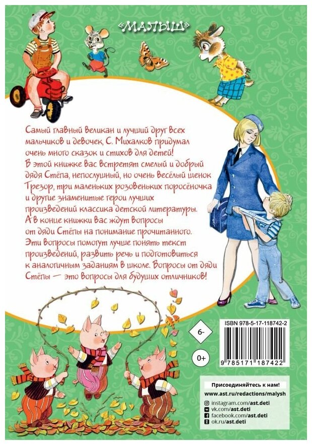 Самый главный великан и лучший друг всех мальчиков и девочек С. Михалков придумал очень много сказок и стихов для детей! В этой книжке вас встретят смелый и добрый дядя Степа, непослушный, но очень веселый щенок Трезор, три маленьких розовеньких поросеночка и другие знаменитые герои лучших произведений классика детской литературы. А в конце книжки вас ждут вопросы от дяди Степы на понимание прочитанного. Эти вопросы помогут лучше понять текст произведений, развить речь и подготовиться к аналогичным заданиям в школе. Вопросы от дяди Степы - это вопросы для будущих отличников! Для дошкольного возраста.