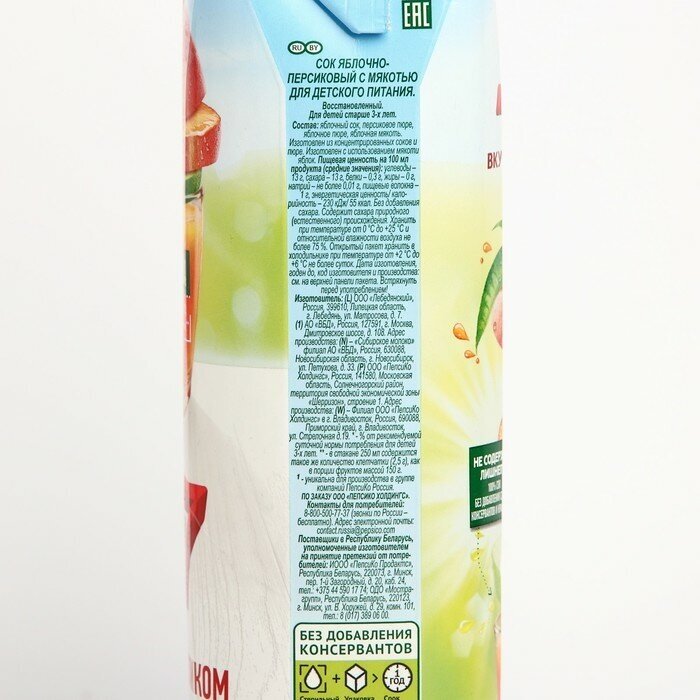 Описание товара:Сок яблочно-персиковый с мякотью J7 0,97 л. Для детского питания. Восстановленный. Для детей старше 3-х лет. 100% сок. Фрукты целиком. Без добавления сахара.Состав товара:Яблочный сок, персиковое пюре, яблочное пюре, яблочная мякоть.Меры предосторожности:Хранить при относительной влажности воздуха не более 75%. Открытый пакет хранить в холодильнике не более суток.