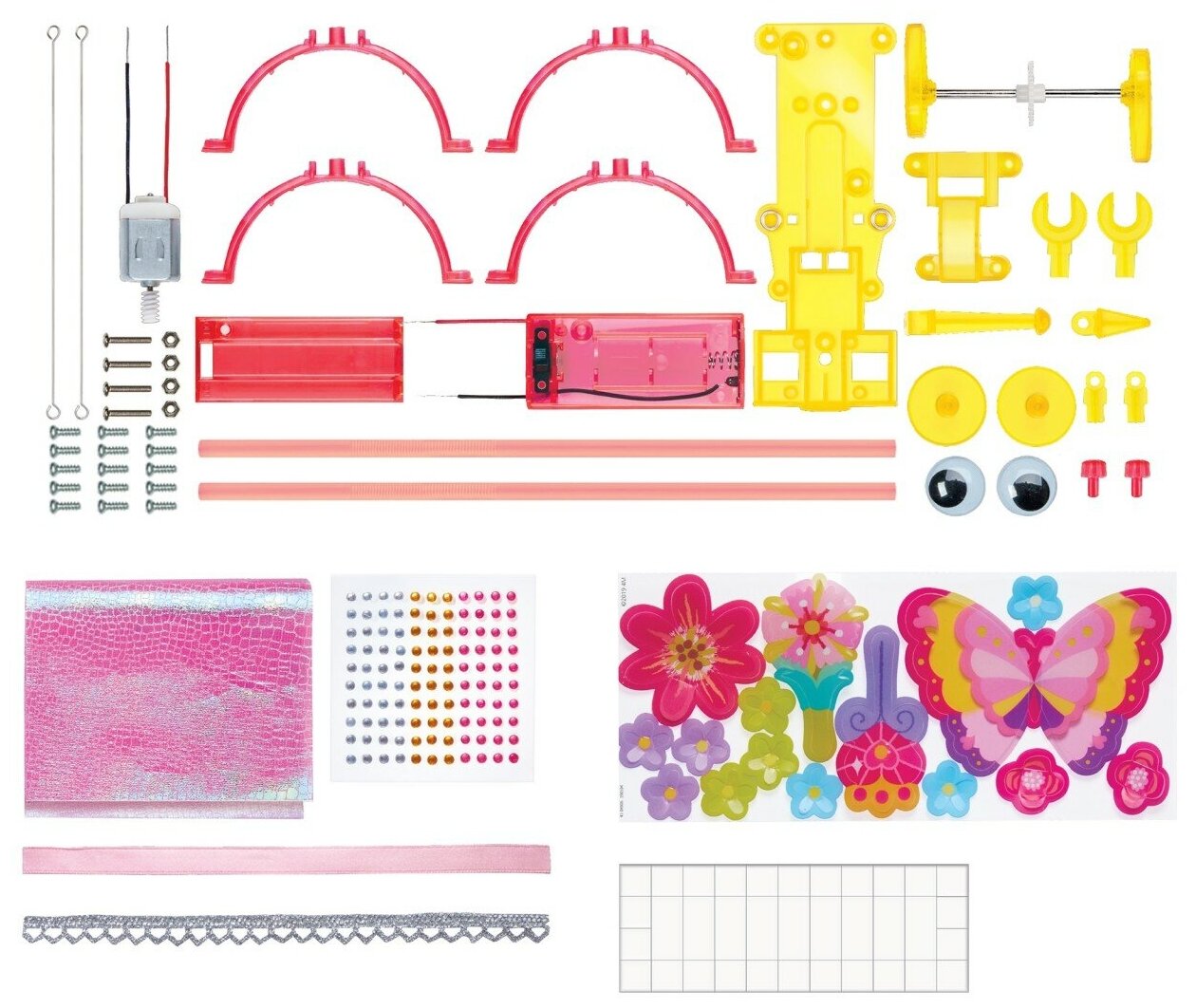 | Комплектация | В комплекте 4 кольца для тела Корпус 4 болта и гайки Винты Короткая нога 2 соломинки 2 клеммные крышки 2 рука-манипуляторы Игрушечный мотор с редуктором 2 глазные пластины Металлическая проволока 2 движущихся глаза Ось с редуктором Крышка двигателя/оси Лоскут розовой ткани Наклейки в виде камней Двусторонняя клейкая лента Кружево Лента Лист с наклейками Также потребуются (не входят в набор) |