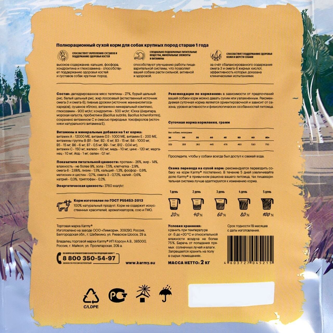 Сервис сравнения цен СкидкаГИД предлагает сравнить цены на товар «Сухой корм для собак Karmy с телятиной для крупных пород 15 кг»
