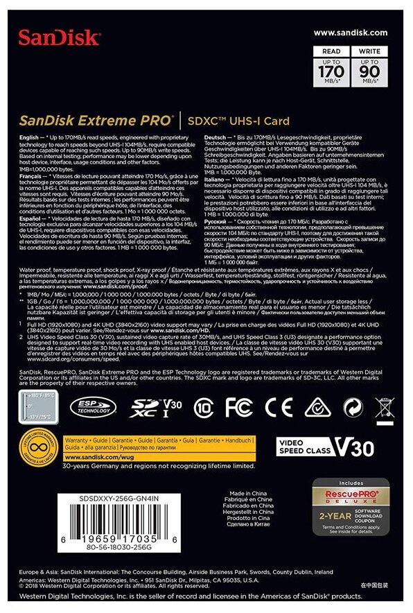 Карта памяти SDXC 512 ГБ Extreme PRO UHS-I от SanDisk емкостью 512 ГБ предназначена для устройств SD, которые могут записывать видео в формате Full HD, 3D и 4K, а также для фотосъемки в режиме серийной съемки. Она совместима с шиной UHS-I и имеет рейтинг класса скорости V30, который гарантирует минимальную скорость записи 30 МБ / с. Если ваше устройство не поддерживает стандарт V30, эта карта также поддерживает стандарт U3, который также гарантирует минимальную скорость записи 30 МБ / с. Поддерживаются скорости чтения до 170 МБ / с, максимальная скорость записи - 90 МБ / с. Встроенный переключатель защиты от записи помогает защитить от случайного стирания данных карты.
