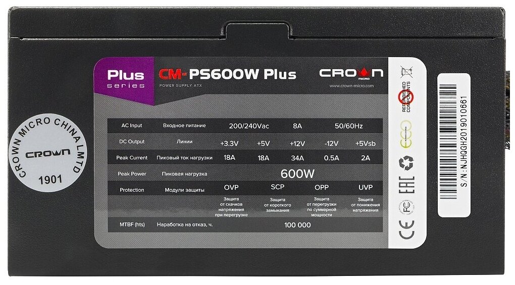 Блок питания CROWN MICRO CM-PS600W Plus 600W черный