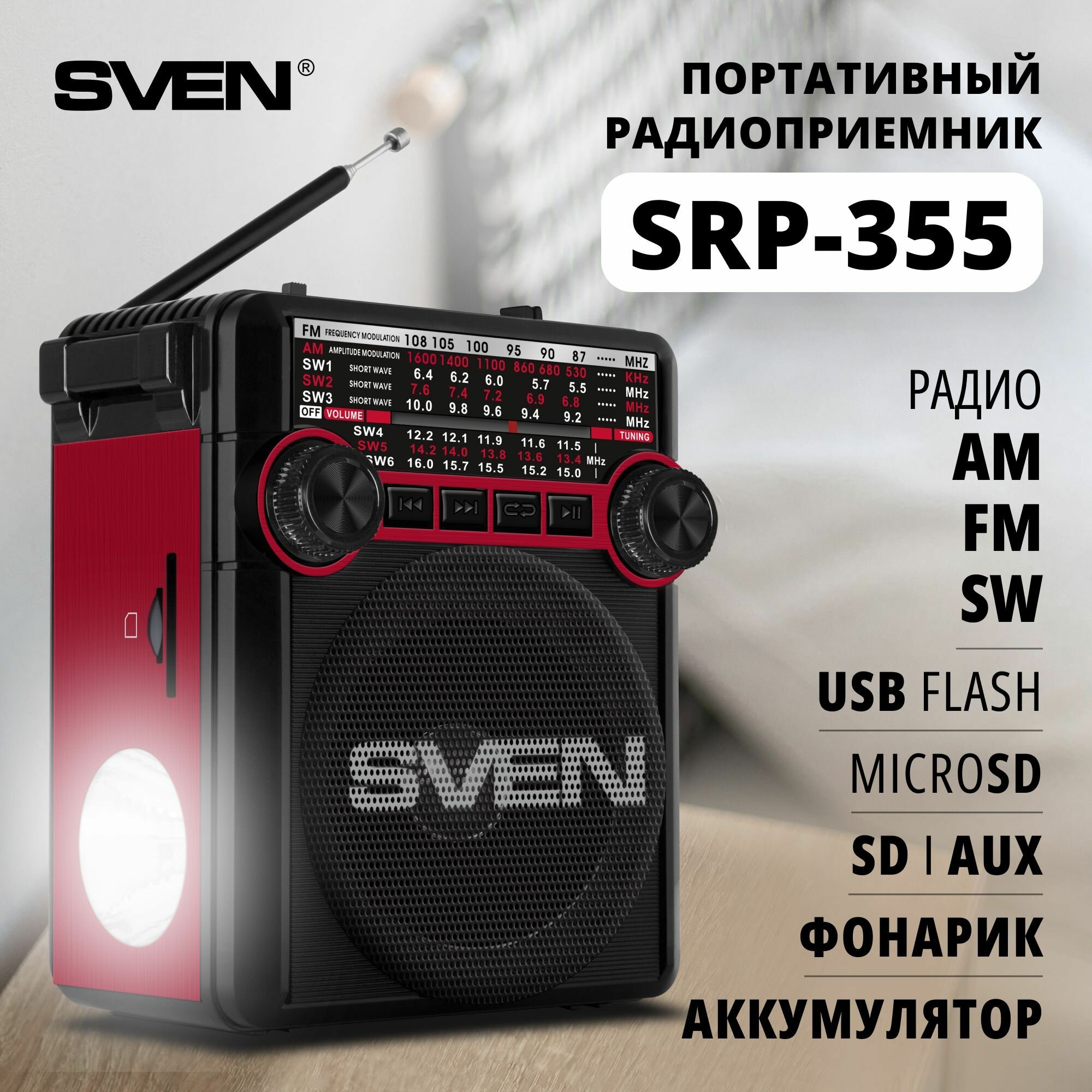 - Всеволновой радиоприемник Sven SRP-355 с МП3 и фонариком
