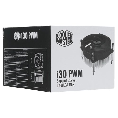 | Кулер CoolerMaster I30PWM [RH-I30-26PK-R1] имеет в своем составе 92-миллиметровый вентилятор, частота вращения которого может меняться от 800 до 2600 оборотов в минуту. Создается воздушный поток, максимальное значение которого равно 31 CFM. Даже на максимальной скорости кулер не доставит вам дискомфорта шумом | уровень шума может достигать не слишком значительных 28 дБ. Приобретение термопасты не потребуется: она нанесена на основание. Кулер упакован в коробку, на которой размещена информация о технических характеристиках модели. |