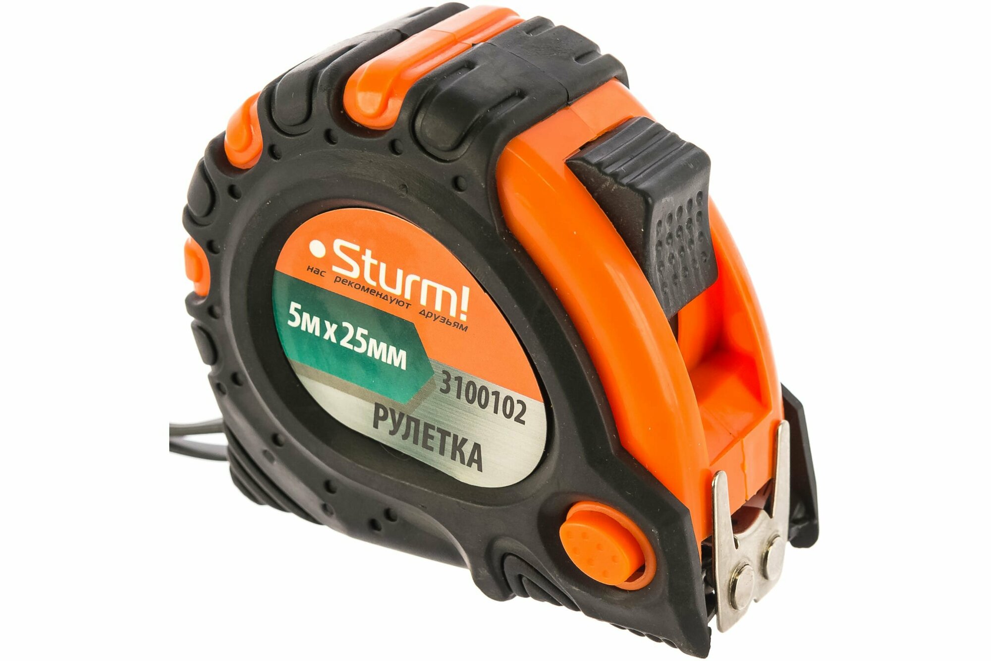 Рулетка STURM измерительный инструмент, предназначенный для вычисления длины.Преимущества Рулетка имеет двухстороннюю шкалу с крупным шрифтом и белый фон, которые обеспечивают хорошую читаемость шкалы Двойной зацеп, оснащенный мощным магнитом позволяет производить измерительные работы без посторонней помощи Полотно изготовлено из качественной стали и имеет увеличенную стойкость к излому Обрезиненный корпус защищает рулетку от повреждений и обеспечивает надежный захват Механизм сматывания усовершенствованной конструкции Три варианта остановки полотна увеличивают комфортность и эффективность работ