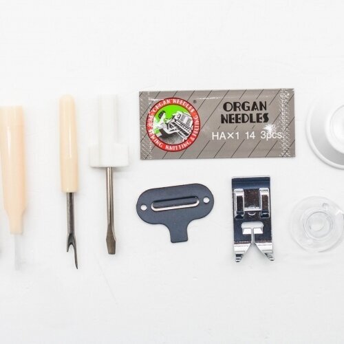 | Дополнительная комплектация | катушковдеватель, комплект игл, нож-вспарыватель, шпулька, педаль, отвертка (большая, маленькая), масленка, инструкция |