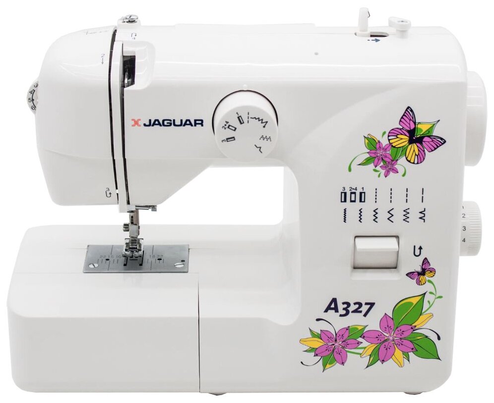 | Прочие особенности и свойства | Цветочный дизайн и набор стандартных операций швейной машины Jaguar A 327 располагают к созданию изделий необычного дизайна. Модель проста в управлении и уходе, оснащена рукавной платформой и комфортным освещением. Машина отлично прошивает различные материалы. При работе с тонкими тканями главное — подобрать соответствующую иглу и отрегулировать натяжение нити колесиком слева. Подходит модель для штопки и пришивания пуговиц. При выполнении этих операций достаточно отключить нижний транспортер. |