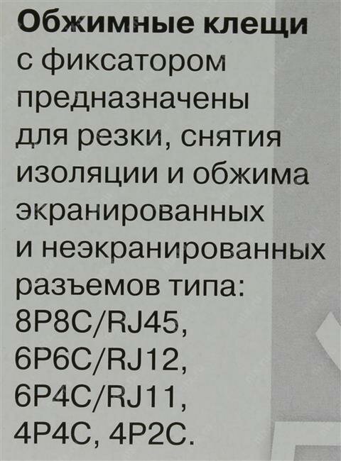 | Описание | Обжимные клещи "обжимки" предназначены для резки, зачистки и обжима кабелей RJ-45, RJ-12, RJ-11 |