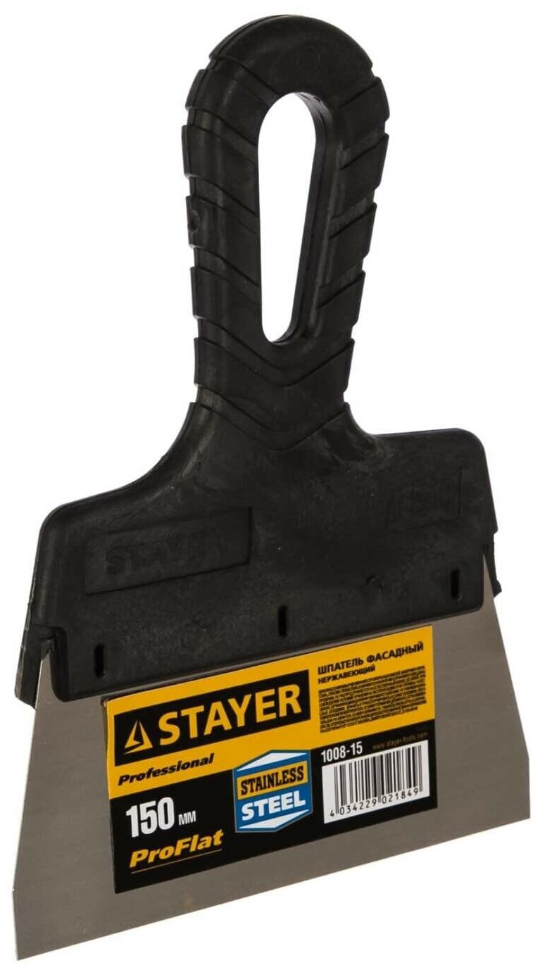 | Прочие особенности и свойства | Шпатель фасадный STAYER PROFESSIONAL, 1008-15 - Незаменимый инструмент при работе с различными строительными смесями на больших поверхностях, полотно из нержавеющей стали обеспечивает надежность и долгий срок службы, а удобная пластмассовая рукоятка создает условия для комфортной работы. |