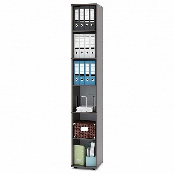 Стеллаж изготовлен из качественного ламинированного ДСП толщиной 16 мм и оснащен пластиковыми ножками. Задняя стенка стеллажа выполнена из ДВП серого цвета.