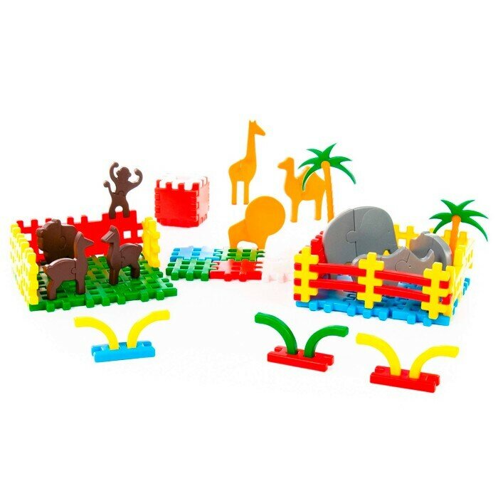 Конструктор Зоопарк Полесье включает в себя 235 элементов. В набор входят фигурки животных (слоны, антилопы, верблюды, бегемоты, медведи, жирафы, обезьяны, львы и носороги), которые собираются по принципу пазла из 2-3 частей. Так же в набор входит 15 видов деталей предназначенных для постройки вольер, загонов, домиков, скамеек. Есть детали, из которых собираются тропические деревья. Конструктор Зоопарк совместим с конструкторами Луна-парк, Фермер, Флора, Семья. Например, соединив конструктор Зоопарк и Луна-парк ребенок сможет построить настоящий парк развлечений, а если добавить конструктор Флора, то можно создать крупный зоологический сад с территорией, украшенной различными клумбами и цветами. Если добавить конструктор Фермер, то можно построить зверосовхоз или экзотическое ранчо для туристов. Так конструктор Зоопарк предоставляет огромный простор для сюжетно-ролевых игр, развивает фантазию ребенка, помогает не только придумывать задачу, но и доводить ее до конкретного результата.
