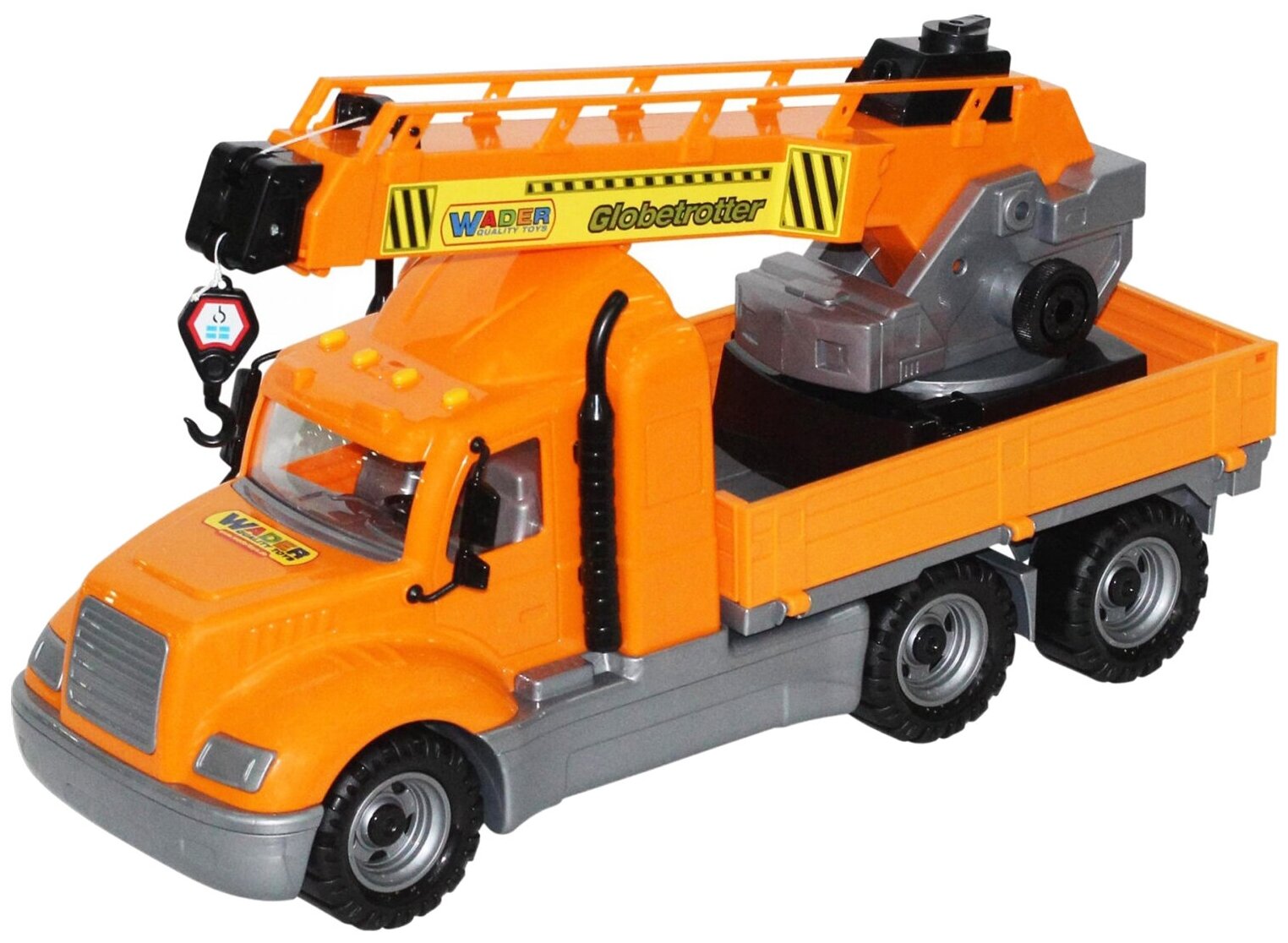 Стойкий к ударам и падениям с заметной ярко-оранжевой расцветкой тягач станет незаменимой игрушкой в играх на улице. Все элементы машины выполнены из современного, особо прочного небьющегося пластика.Грузовик выполнен по образу и подобию своих иностранных собратьев: у него такая же обтекаемая форма кабины, две большие боковые выхлопные трубы и мощная радиаторная решетка. Дополняют образ «маячки» наверху кабины.Кабина грузовика «застеклена», а внутри находятся кресла, приборная панель и руль.На крепком корпусе при помощи металлических осей прикреплены три пары больших рельефных колес. За счет такого колесного «оснащения» машина может справиться с любым бездорожьем.Погрузочная машина «Майк» оснащена платформой, борта которой легко и просто открываются и закрываются с трех сторон. На платформе располагается выдвижной кран, вращающаяся вокруг своей оси. Кран выдвигается за счет двух круглых боковых «ручек». Сбоку нанесена шкала от 1 до 10. Крюк можно поднимать и опускать при помощи катушки на стреле автокрана.Грузовик серии «Майк» сочетает в себе качество, безопасность, практичность и яркий, интересный дизайн.