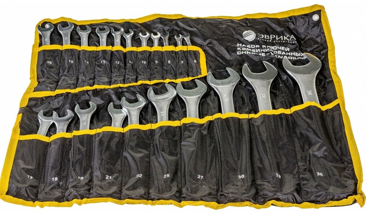 Набор ключей комбинированных Эврика ER‑10210 — это универсальный комплект из 21 рожково‑накидного ключа 6–36 мм с сатинированным покрытием, выполненного из хром‑ванадиевой стали CrV, упакованного в планшет‑сумку. Он предназначен для монтажа и демонтажа шестигранного крепежа различной сложности в автосервисе, строительстве, монтаже и быту, включая тяжелые и крупные соединенияПреимущества Сталь CrV и сатинированное покрытие обеспечивают прочность, долгий срок службы и устойчивость к нагрузкам и ржавчине Расширенный набор из 21 ключа покрывает большинство размеров, включая крупные 30–36 мм, экономя место и вес по сравнению с несколькими наборами, удобен для переноски Планшет‑сумка удобна для хранения и переноски, удерживает ключи в порядке, без потери, что особенно важно в автосервисе и строительстве