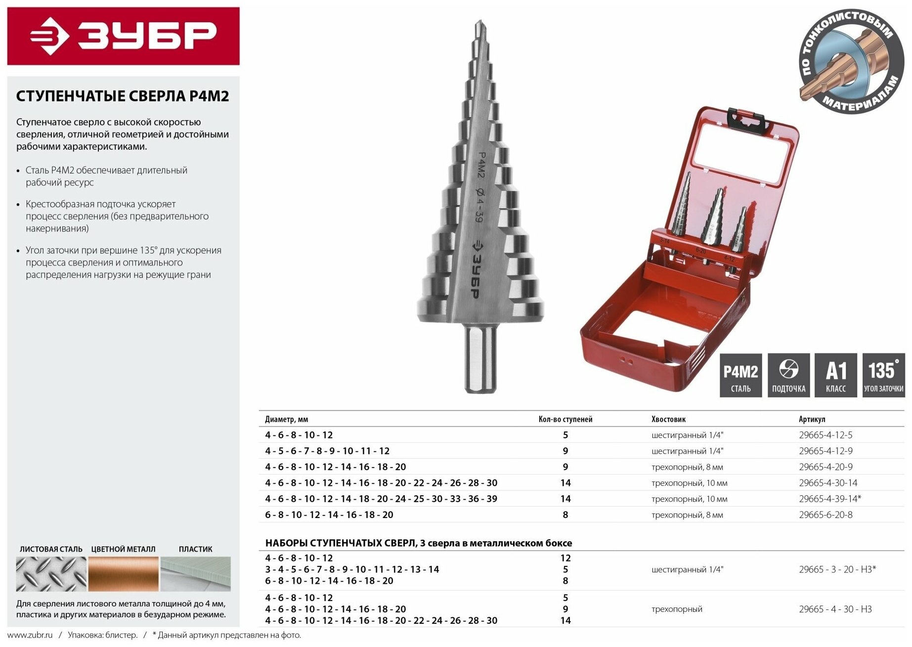 Сверло ЗУБР "МАСТЕР" ступенчатое по сталям и цвет.мет., быстрорежущая сталь, d=4-30мм, 14ступ.d=4-30, L-100мм, трехгран. хв.10мм