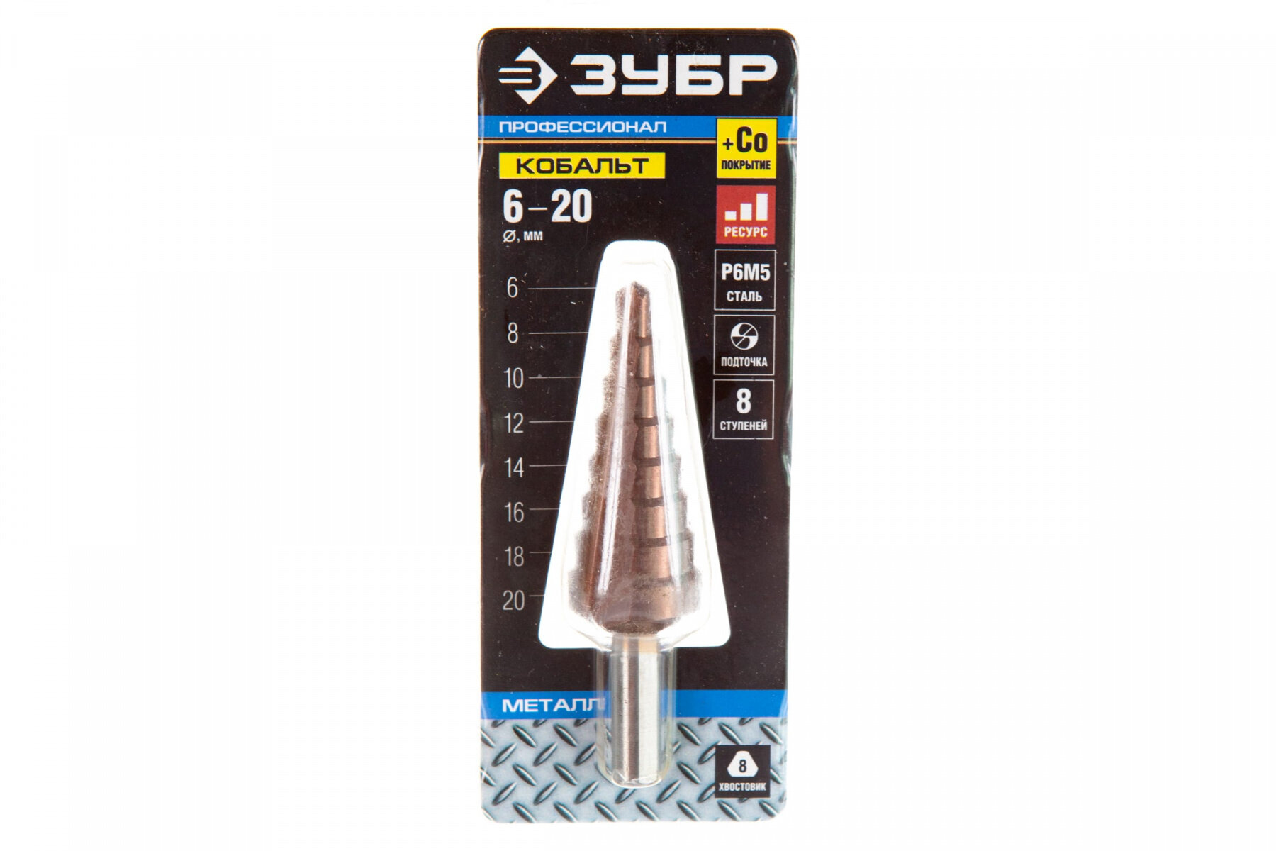 | Прочие особенности и свойства | Сверло ЗУБР "КОБАЛЬТ" ступенчатое по сталям и цветным металлам, Материал: быстрорежущая сталь Р6М5 с кобальтовым покрытием, Диаметры: 6-8-10-12-14-16-18-20 мм (8 ступеней), Длина |