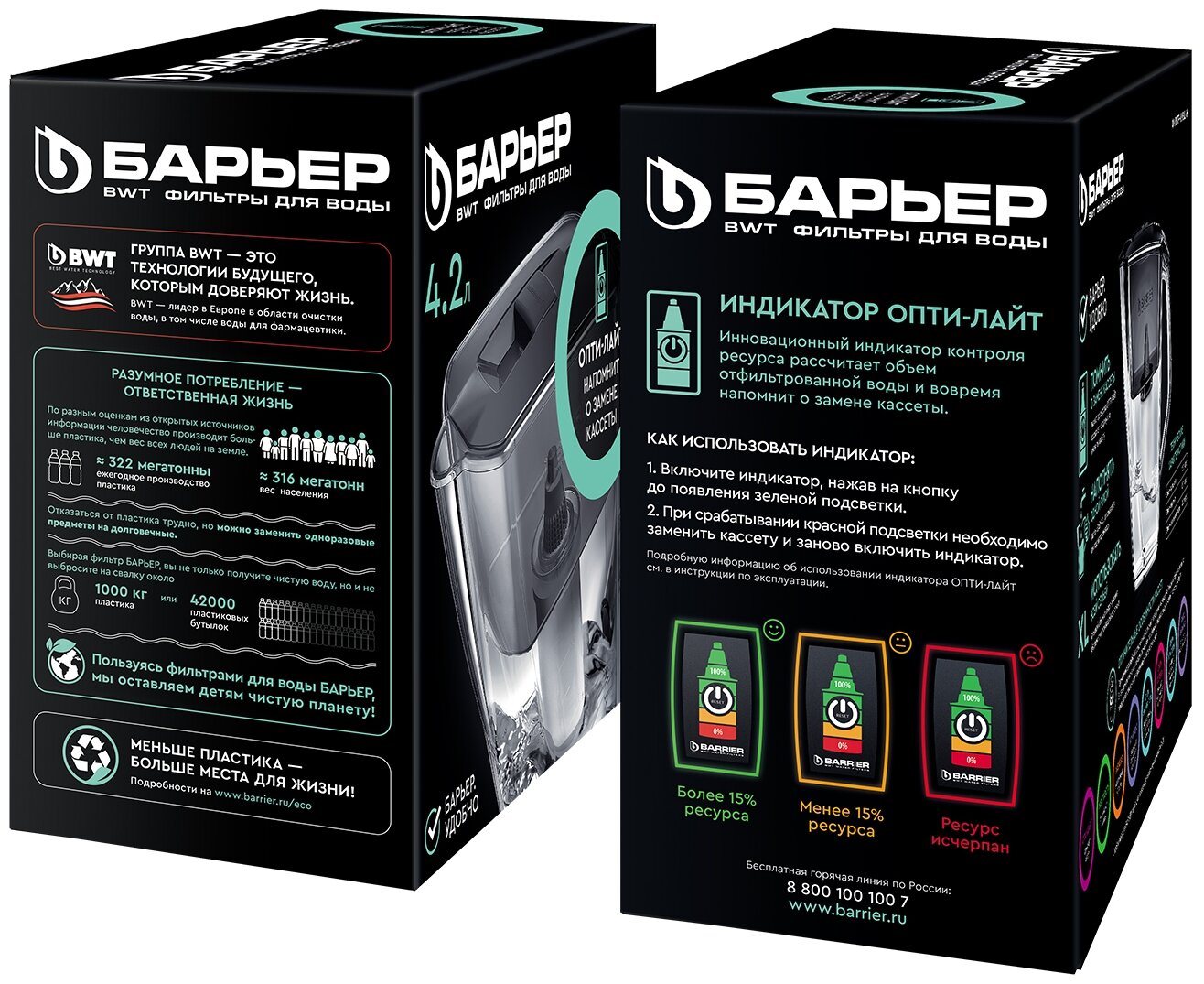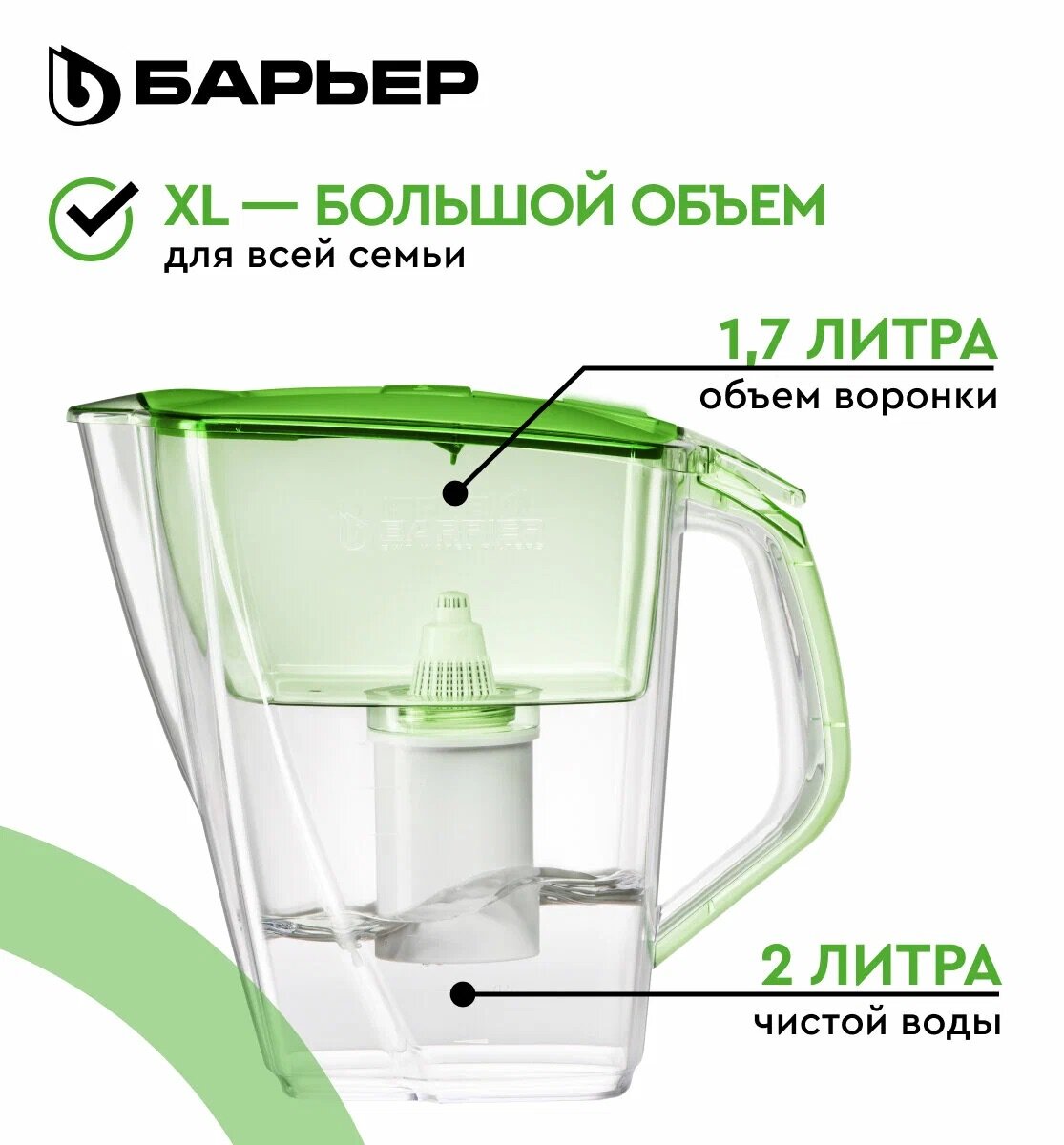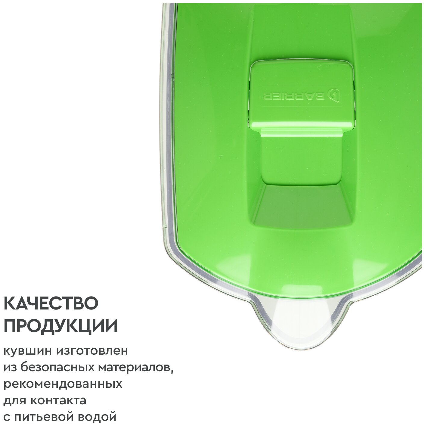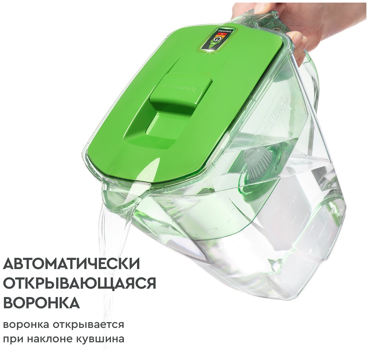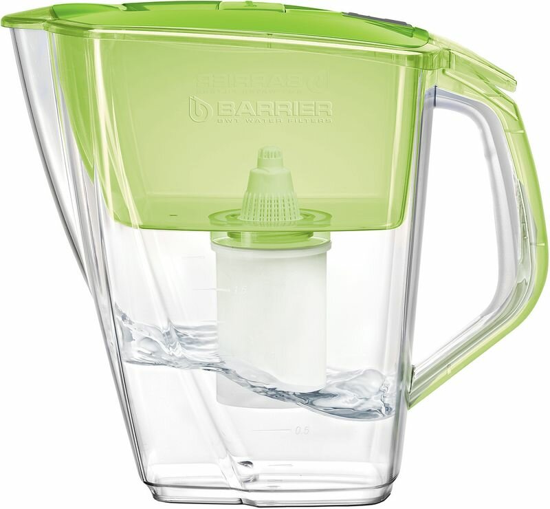 Вместительный кувшин для всей семьи в сочном оттенке "зеленое яблоко." Отлично впишется на любую кухню. Удобный клапан на крышке позволяет наполнить кувшин одной рукой. Электронный индикатор вовремя подскажет, когда придет время менять кассету. В комплекте с кувшином кассета БАРЬЕР Стандарт, которая защитит от хлора, тяжелых металлов и других вредных примесей. Резьбовое крепление кассеты исключает попадание неотфильтрованной воды в очищенную. Кувшин можно мыть в посудомоечной машине. Одна кассета БАРЬЕР способна заменить несколько сотен пластиковых бутылок. По окончании ресурса кассету можно сдать на переработку. за исключением крышки с электронным индикатором.