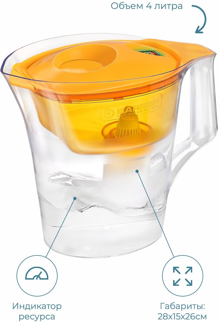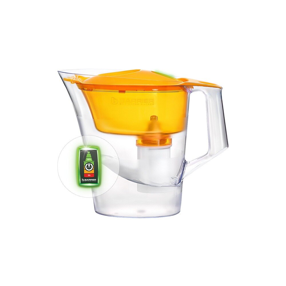 Вместительный кувшин для всей семьи в ярком оттенке "сочный апельсин." Матовые полосы на корпусе выгодно подчеркивают форму кувшина. Удобный клапан на крышке позволяет наполнить кувшин одной рукой. Электронный индикатор подскажет, когда придет время менять кассету. Кувшин можно мыть в посудомоечной машине за исключением крышки с индикатором. В комплекте с кувшином кассета БАРЬЕР Стандарт, которая защитит от хлора, тяжелых металлов и других вредных примесей. Резьбовое крепление кассеты исключает попадание неотфильтрованной воды в очищенную. Одна кассета БАРЬЕР способна заменить несколько сотен пластиковых бутылок. По окончанию ресурса кассету можно сдать на переработку.