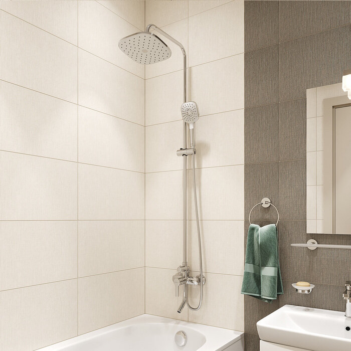| Комплектация | смеситель, душевой шланг, душевая лейка, штанга, верхний душ, инструкция |