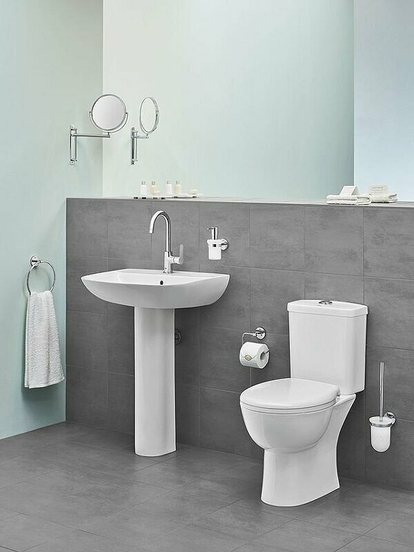 Унитаз компакт Grohe Bau Ceramic . Комплект Bau Ceramic из идеально сочетающихся друг с другом напольного унитаза, смывного бачка и сиденья порадует своей простой, но элегантной эстетикой и привлекательной ценой как тех, кто планирует капитальный ремонт, так и тех, кто решил избавиться от надоевшего старого унитаза.
