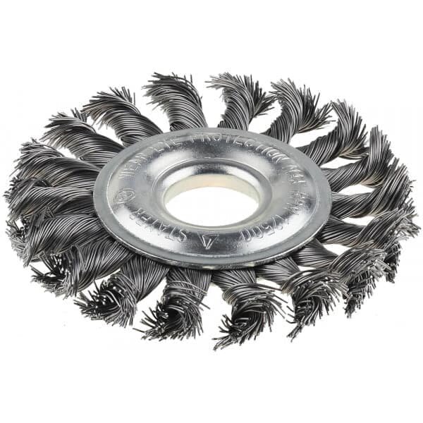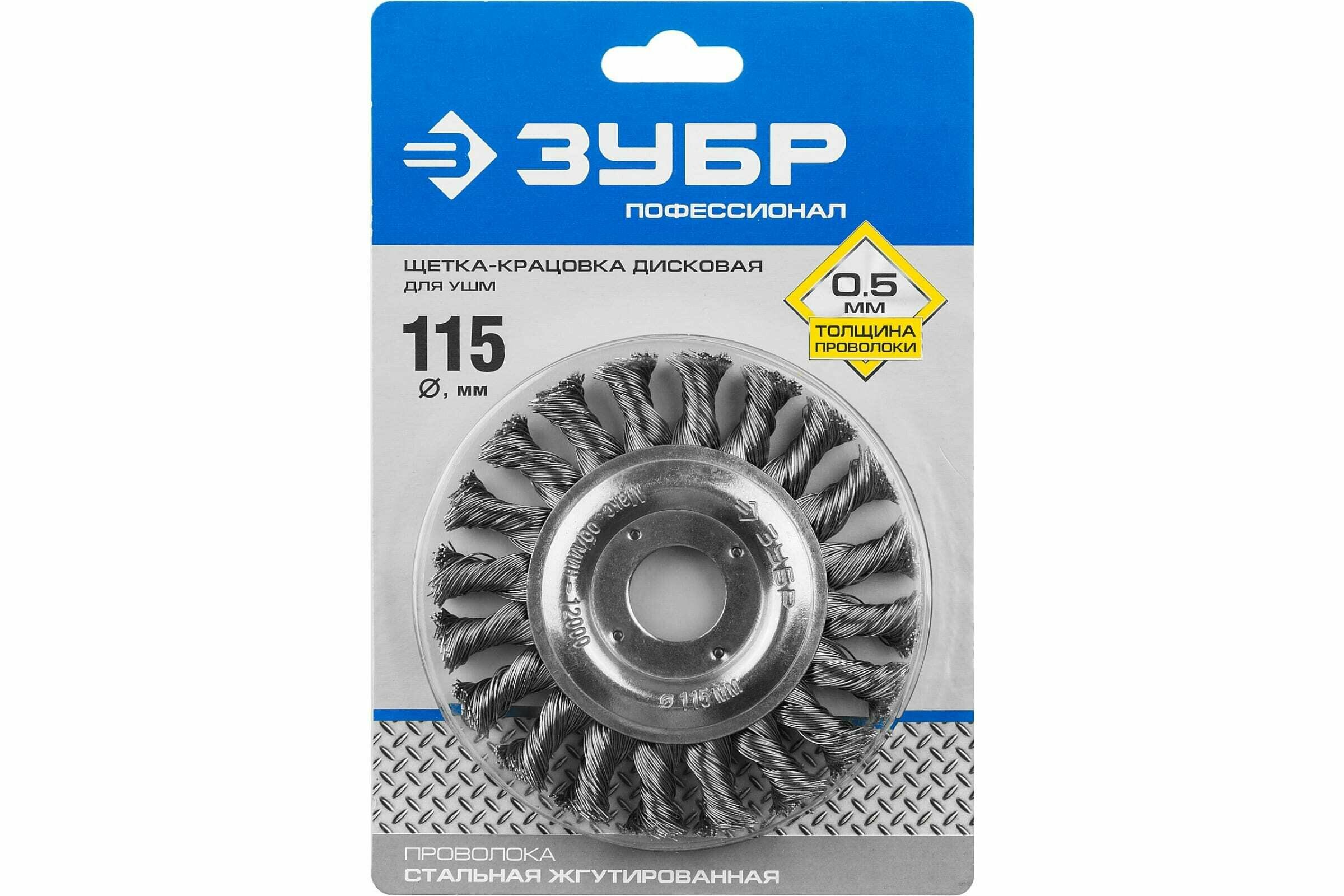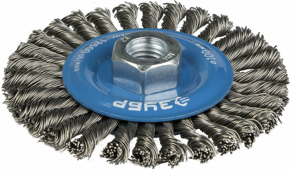 Щетка дисковая Зубр является сменным элементом для угловых шлифмашин. Используется для зачистки поверхностей от старых лакокрасочных покрытий, ржавчины, окалины. Рабочая часть состоит из скрученной в пучки стальной проволоки диаметром 0.5 мм.