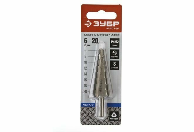 Сверло ступенчатое Зубр 6-20мм, HSS-R, быстрорежущая сталь М2(S6-5-2) Р6М5, класс А 8 ступеней