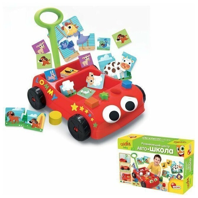Настоящий развивающий центр на колесах. Красная машина с открытым кузовом и удобной ручкой на задней части кузова включает в себя: сортер с разноцветными формочками; 8 пазлов с фигурками животных, которые собираются из 4-х частей; 12 карточек-пазлов «Мамы и детеныши», в которых нужно правильно совмещать 2 половинки изображения; игра «Мемори», на развитие памяти и запоминание названий животных.