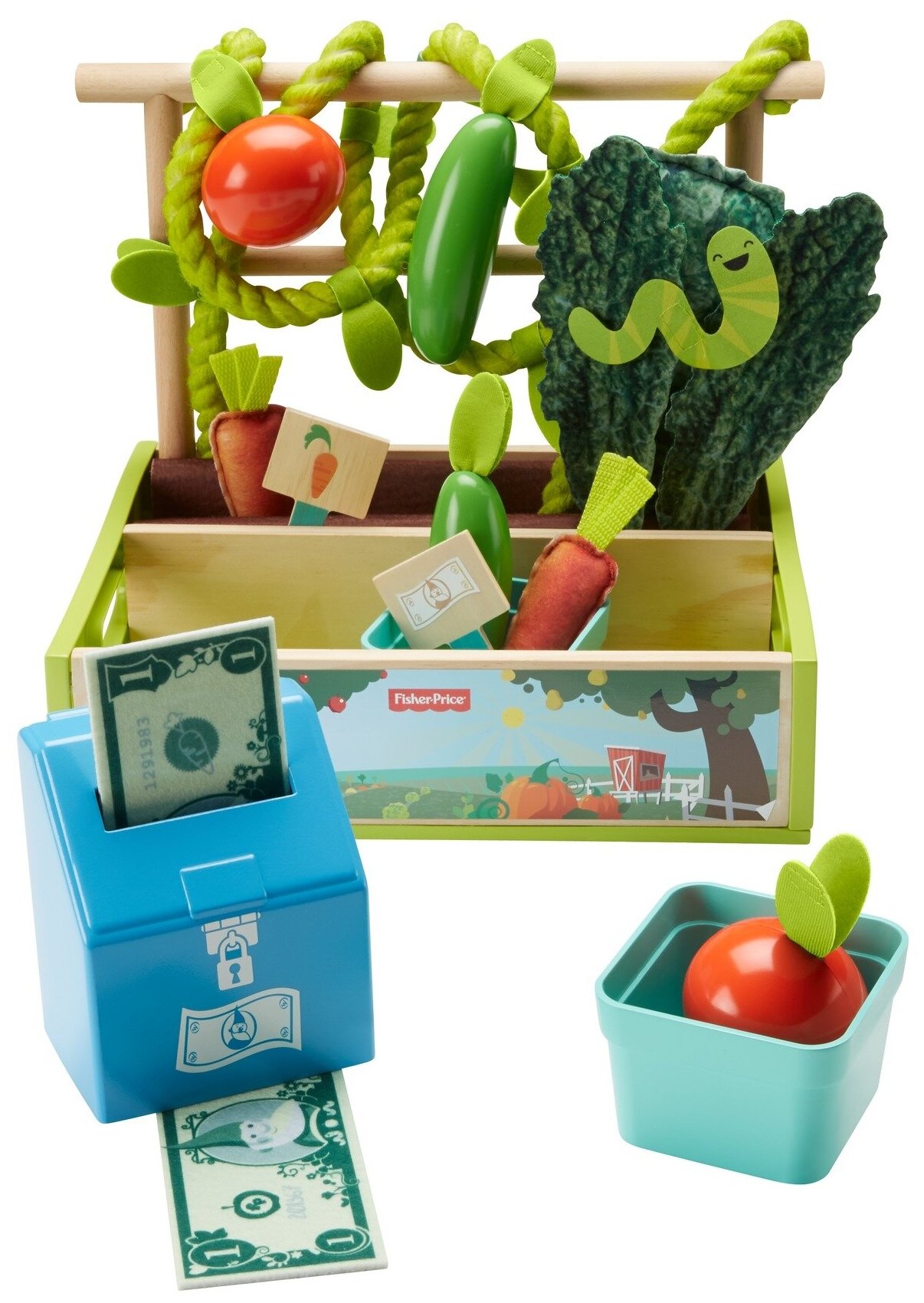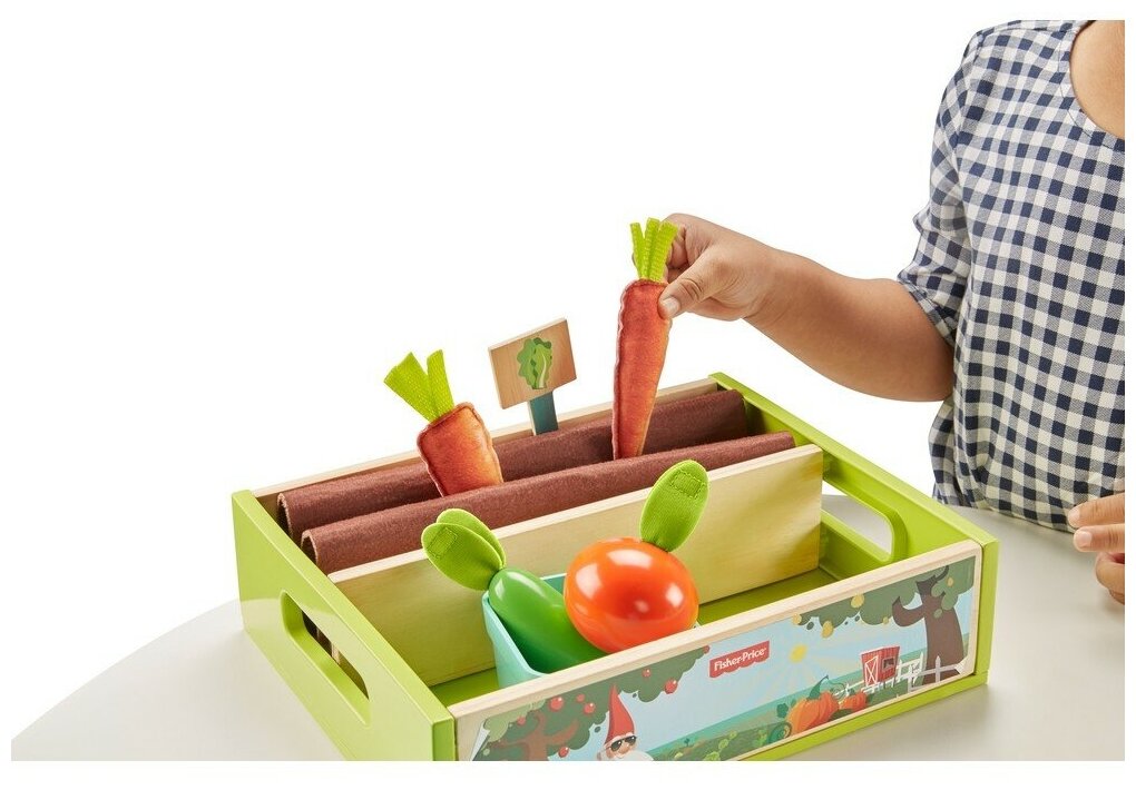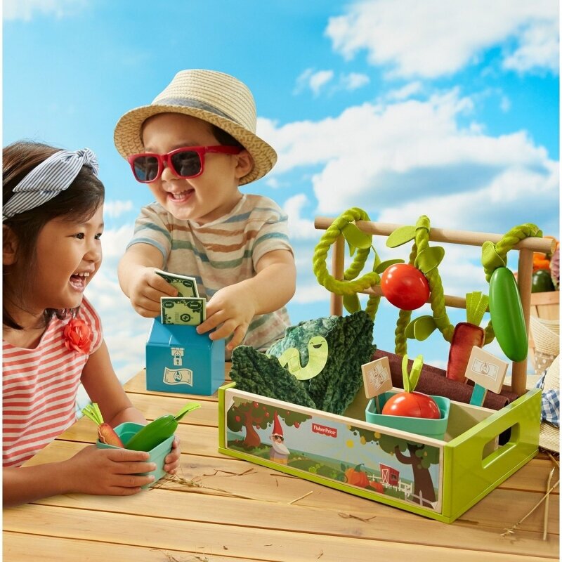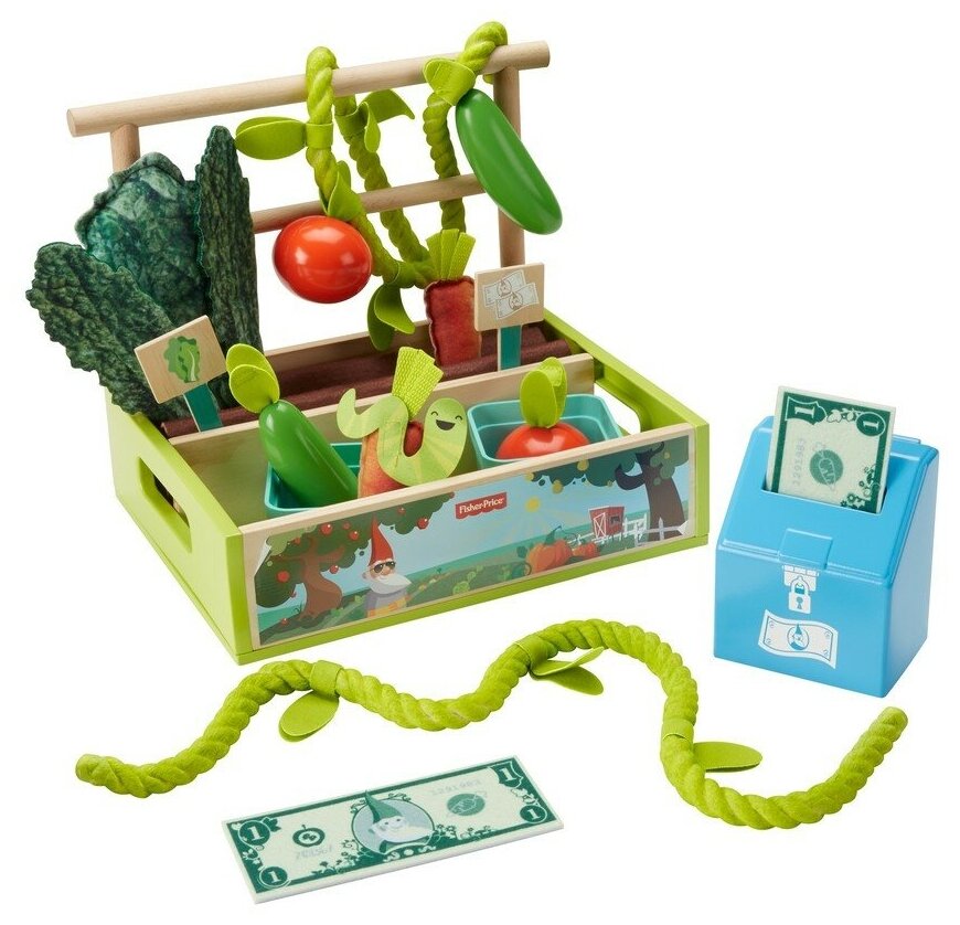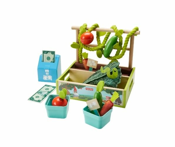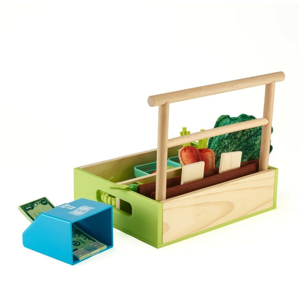 | Комплектация | ящик для посадки фруктов и овощей с ручкой, 2 деревянных рейки, овощи и фрукты, 2 корзины, 2 вывески с ценниками, 1 кассовый аппарат, 2 денежные купюры, фигурка червяка |
