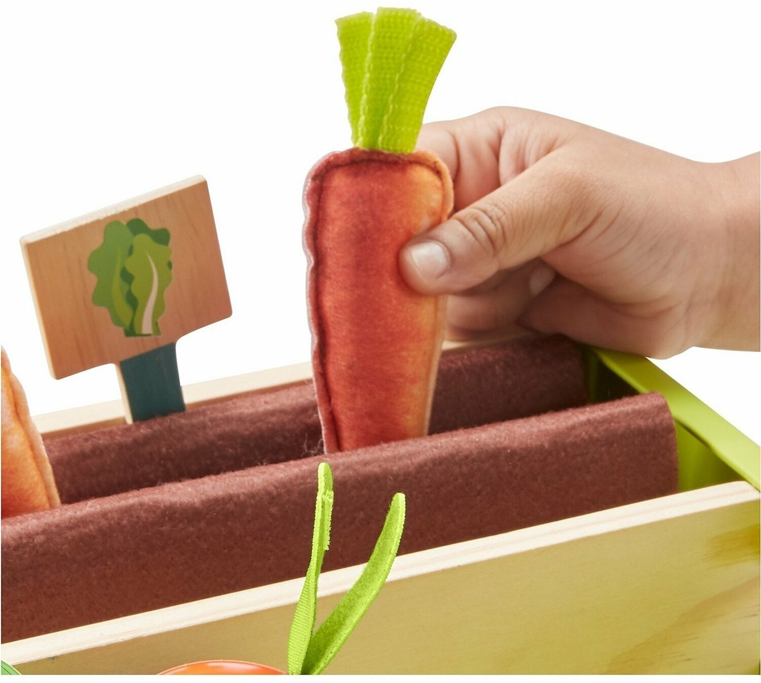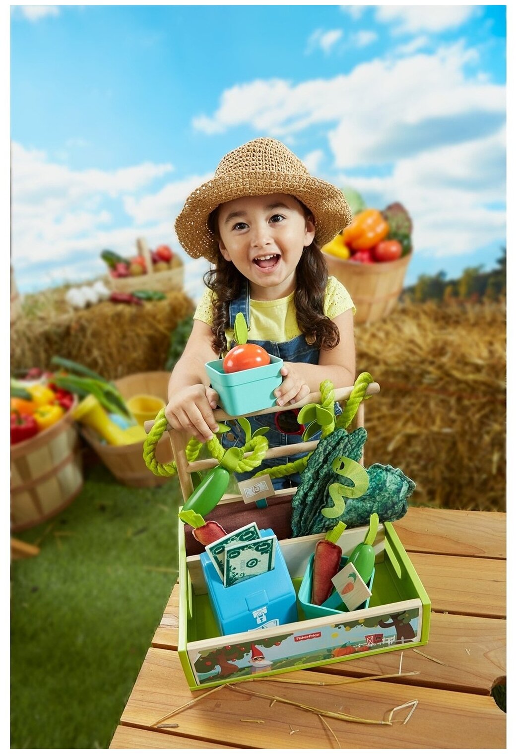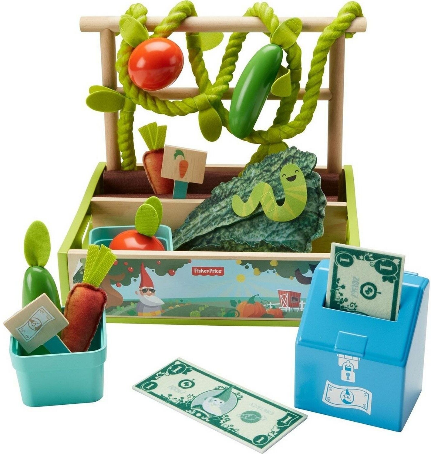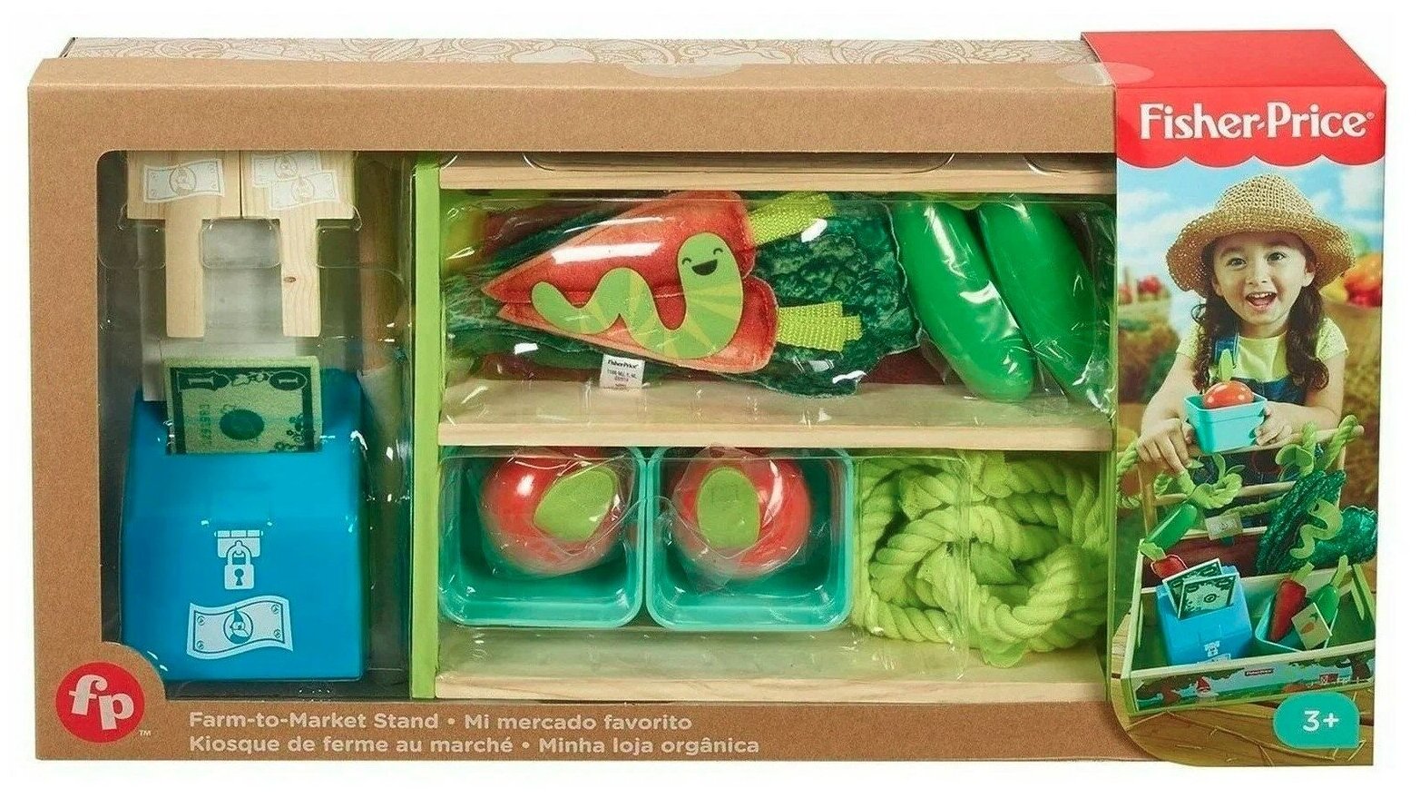 | Комплектация | ящик для посадки фруктов и овощей с ручкой, 2 деревянных рейки, овощи и фрукты, 2 корзины, 2 вывески с ценниками, 1 кассовый аппарат, 2 денежные купюры, фигурка червяка |