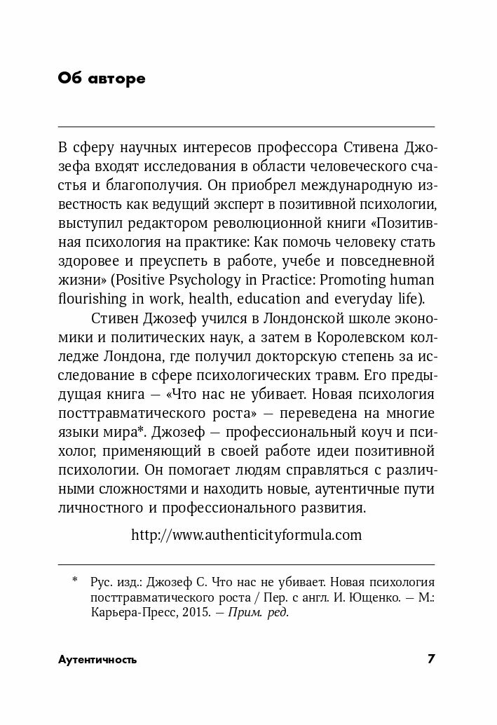 Общественное мнение и собственные комплексы зачастую мешают нам быть собой. Многие из нас настолько привыкают носить маски, что перестают понимать, где настоящая жизнь, а где навязанная обстоятельствами роль. Постепенно мы утрачиваем аутентичность — умение слышать себя и делать то, что приносит радость. Отдавая годы нелюбимой работе и общению не с теми людьми, мы сетуем, что наша жизнь не удалась. Желание быть собой обычно возвращается после жесткой встряски — например, смерти близкого человека или потери бизнеса. Но его можно вернуть и менее травмирующим путем. Каким именно, рассказывает мировой эксперт в области позитивной психологии Стивен Джозеф в книге «Аутентичность: Как быть собой». Он подкрепляет теорию примерами из своей обширной практики и предлагает простые упражнения, помогающие вернуть себе аутентичность и стать счастливым человеком.
